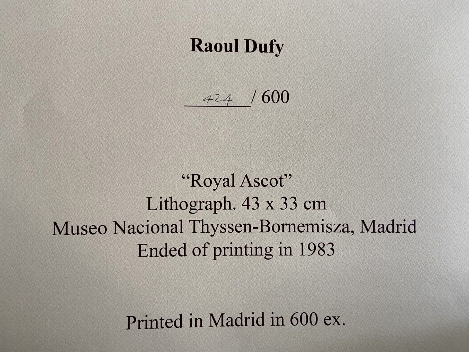 RAOUL DUFY "Ascot Racecourse" Lithograph from an work by the master Raoul Dufy, printed in 1983 by the Thyssen-Bornemisza National Museum, Madrid. Raoul Dufy signature on the plate. The graphic work measures 43x33 cm The edition was s tampata in Madrid in 600 ex. hand numbered. Museo Nacional Thyssen-Bornemisza, Madrid. Like Edgar Degas, Egon Schiele, Piet Mondrian, Georges Braque, Raoul Dufy, Ren Magritte, Edvard Munch, Gustav Klimt, Paul Cezanne, Renoir, Rembrandt, Picasso, Amedeo Modigliani, Constantin Brancusi , Paul Gauguin, Georges Seurat, Henri De Toulouse-Lautrec , Vassily Kandinsky, Henri Matisse was one of the greatest artists of the twentieth century. RAOUL DUFY "Ascot Racecourse" Lithograph from an work by the master Raoul Dufy, printed in 1983 by the Thyssen-Bornemisza National Museum, Madrid. Raoul Dufy signature on the plate. The graphic work measures 43x33 cm The edition was stampata in Madrid in600 ex. hand numbered. Museo Nacional Thyssen-Bornemisza, Madrid. Like Edgar Degas, Egon Schiele, Piet Mondrian, Georges Braque, Raoul Dufy, Ren Magritte, Edvard Munch, Gustav Klimt, Paul Cezanne, Renoir, Rembrandt, Picasso, Amedeo Modigliani, Constantin Brancusi , Paul Gauguin, Georges Seurat, Henri De Toulouse-Lautrec , Vassily Kandinsky, Henri Matisse was one of the greatest artists of the twentieth century. RAOUL DUFY "Ascot Racecourse" Lithograph from an work by the master Raoul Dufy, printed in 1983 by the Thyssen-Bornemisza National Museum, Madrid. Raoul Dufy signature on the plate. The graphic work measures 43x33 cm The edition was stampata in Madrid in600 ex. hand numbered. Museo Nacional Thyssen-Bornemisza, Madrid. Like Edgar Degas, Egon Schiele, Piet Mondrian, Georges Braque, Raoul Dufy, Ren Magritte, Edvard Munch, Gustav Klimt, Paul Cezanne, Renoir, Rembrandt, Picasso, Amedeo Modigliani, Constantin Brancusi , Paul Gauguin, Georges Seurat, Henri De Toulouse-Lautrec , Vassily Kandinsky, Henri Matisse was one of the greatest artists of the twentieth century.