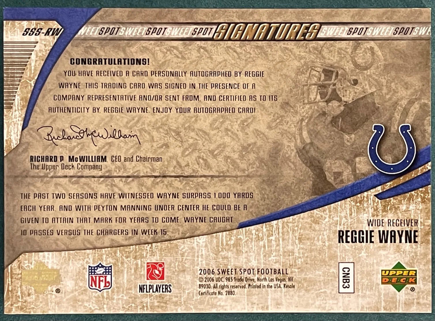 Reggie Wayne Autographed 2006 Upper Deck Sweet Spot Card #57/100
