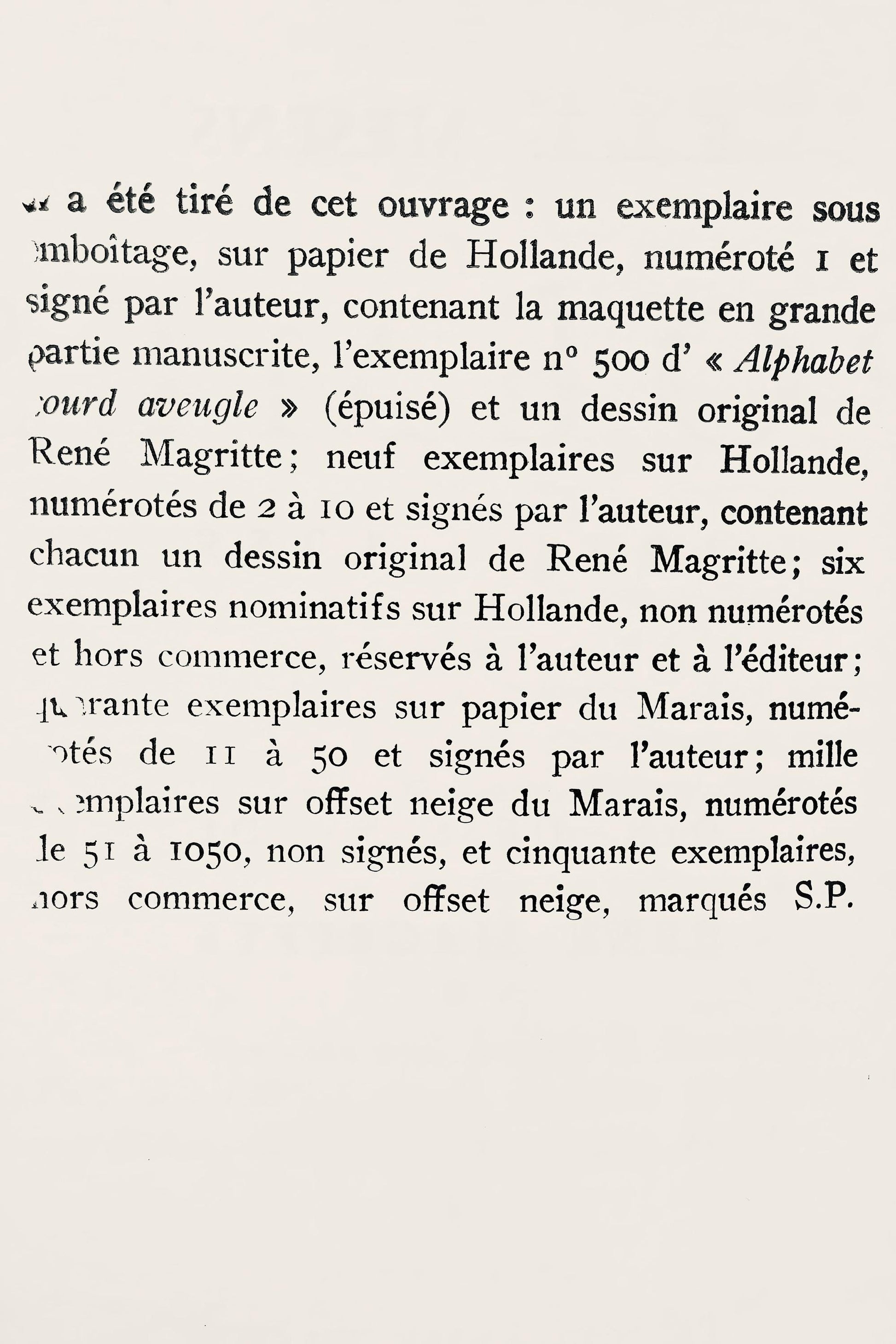 Published and printed by Le Terrain Vague, Paris, 1959. Excerpted from the volume (translated from French), It was taken from this volume: an example on papier de Hollande, numbered I and signed by the author, containing the largely handwritten model, example ND of "Alphabet souris aveugle" (sold out) and an original drawing by Ren Magritte; nine examples on papier de Hollande, numbered from II to IX and signed by the author, each containing an original drawing by Ren Magritte; VI nominative examples on papier de Hollande, unnumbered and out of commerce, reserved for the author and the publisher; XIV examples on papier du Marais, numbered from Il to L and signed by the author; M examples on offset papier du Marais, numbered from LI to ML, unsigned, and L examples, out of commerce, offset, marked S.P.
