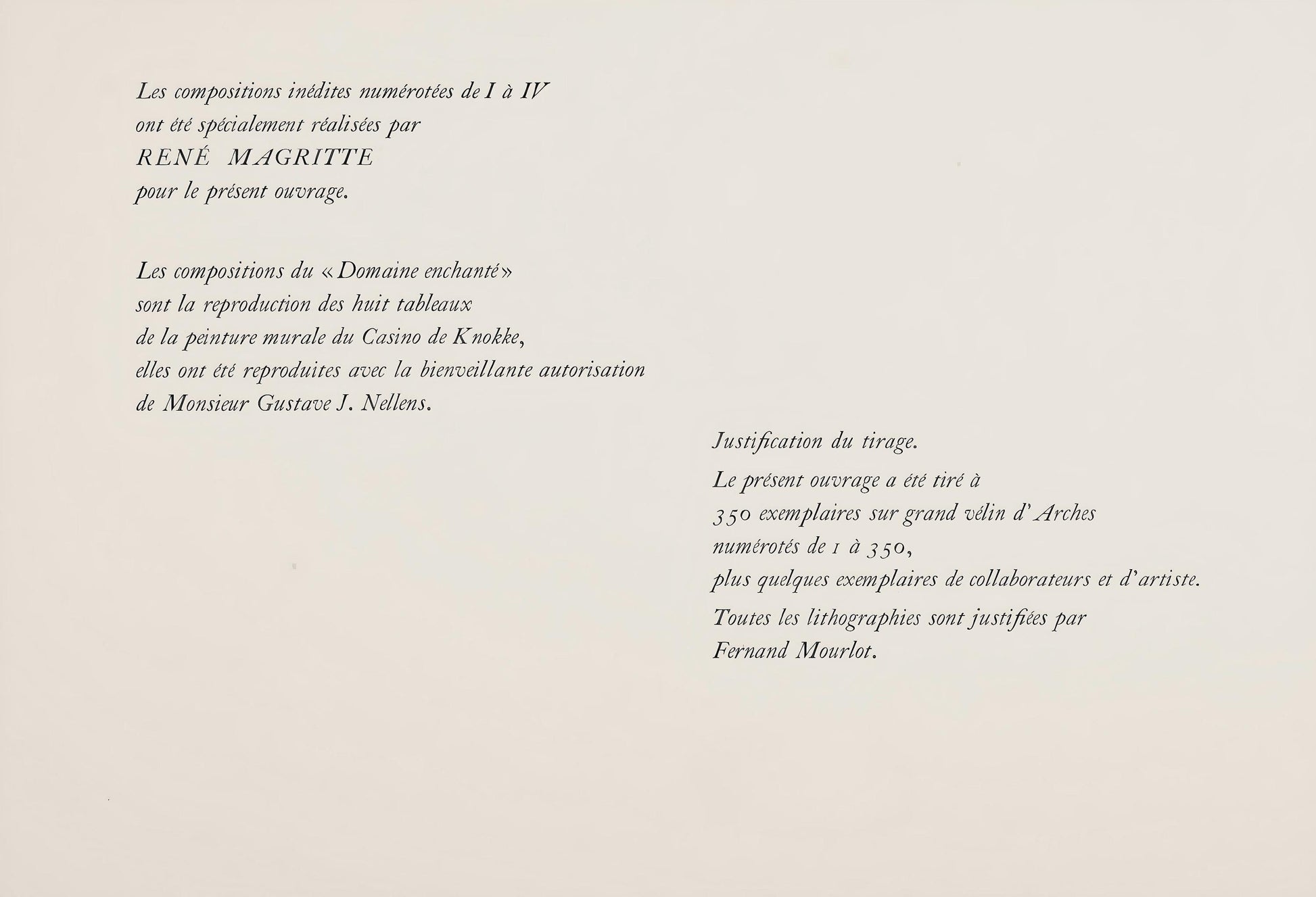 Lithograph in colors on grand velin d'Arches paper. Paper Size: 17.5 x 23.5 inches. Inscription: Signed in the plate by the artist; hand signed in pencil by the printer, Fernand Mourlot, as issued. Notes: From the suite, Les Enfants Trouvs de Magritte, 1968. Published by A.C. Mazo et Cie, Paris; printed by Mourlot Frres, Paris, under the supervision of Fernand Mourlot, Paris, 1968. Excerpted from the folio (translated from French), The unpublished compositions numbered from I to IV were specially made by Ren Magritte for this album. The compositions of the Domaine enchant is the lithography of the eight paintings of the mural of the Casino de Knokke; they were translated with the benevolent permission of Monsieur, Gustave J. Nellens. Justification of the draw: This album was drawn in CCCL examples on grand velin d'Arches, numbered from I to CCCL, plus some copies of collaborators and artist. All lithographs are justified by Fernand Mourlot.