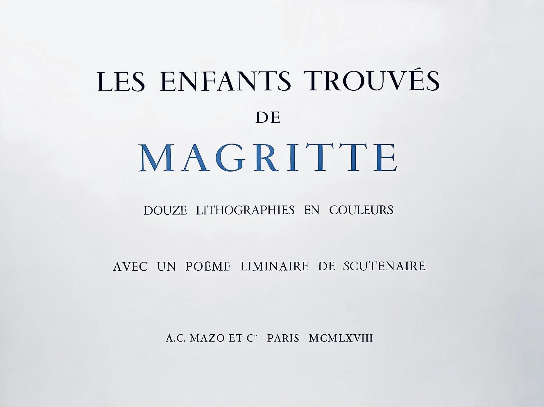 Lithograph in colors on grand velin d'Arches paper. Paper Size: 17.5 x 23.5 inches. Inscription: Signed in the plate by the artist; hand signed in pencil by the printer, Fernand Mourlot, as issued. Notes: From the suite, Les Enfants Trouvs de Magritte, 1968. Published by A.C. Mazo et Cie, Paris; printed by Mourlot Frres, Paris, under the supervision of Fernand Mourlot, Paris, 1968. Excerpted from the folio (translated from French), The unpublished compositions numbered......