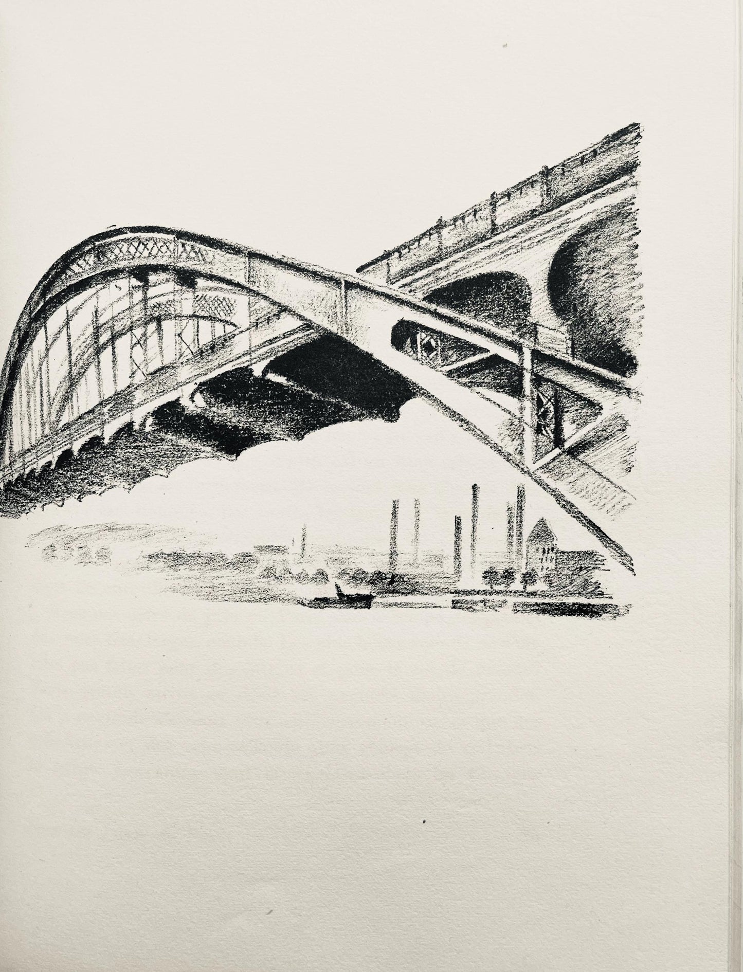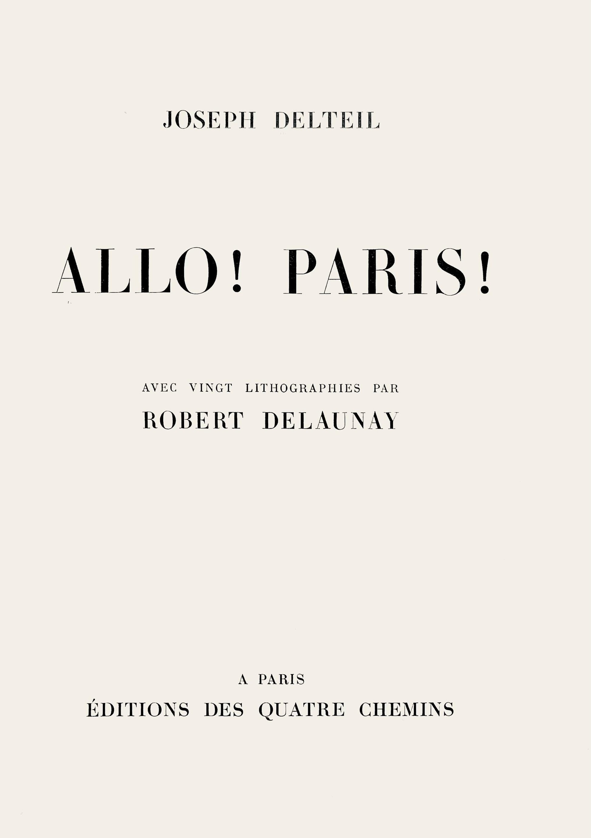 Lithograph on vlin dArches paper. Paper Size: 11 x 9 inches. Excellent condition. Inscription: Unsigned and unnumbered, as issued. Notes: From the volume, Allo! Paris!, 1926. Published by ditions des Quatre Chemins, Paris; printed by Engelmann, Graf, Coindet & Company, Paris, and L'Imprimerie du Livre, Paris, October 15, 1926. Excerpted from the volume (translated from French), This volume has been finished printing October, Fifteen, 1926. For the text: by the printing of the book A. Rueil, H. Filipacchi being director, and for engravings by Engelmann printerlithographs in Paris. It was taken from this volume: an example on hollande van paper gelder with a sequel of lithographs on paper from china, and original sketches, bearing number 1 to 24 examples on holland paper van gelder with a suite of paper lithographs from china, numbered from 2 to 25, and 300 examples on arches paper numbered from 26 to 325. It was also pulled out of trade: 15 examples on holland paper van gelder, numbered from I to xv. 25 examples on arches paper, numbered from xvi to xl. Quoted from the catalogue entry from the Staatsgalerie Stuttgart (translated from German), Based on drawings and motifs from his paintings, Robert Delaunay created the lithographs for ALLO! PARIS! Avec vingt lithographies par Robert Delaunay. They illustrate poems by Joseph Delteil in ten chapters and show all the important sights of the French metropolis, including some from unusual perspectives from a bird's eye view: Sacr-Coeur, the le de la Cit with Ntre-Dame, Saint Svrin, the Arch de Triumph on the Place de l'toile, the Place de la Concorde, Montmartre, the boulevards, the Seine with its bridges and of course the Eiffel Tower. This only work illustrated by Delaunay is a declaration of love to Paris in text and images. Quoted from the catalogue entry from The Minneapolis Institute of Art, One of the pioneers of European modernism, Robert Delaunay was primarily a painter, only occasionally delving into printmaking and book illustration. Indeed, Allo! Paris! features his only original book illustrations. The book's subject is the rhythm and vitality of Paris, as manifested in its various architectural landmarks. Delaunay focuses on the Eiffel Tower, which at the time was the world's tallest structure and a potent symbol of modernity. The 20 monochromatic lithographs offer a glimpse of Delaunay's fascination with Cubist fragmentation of space.