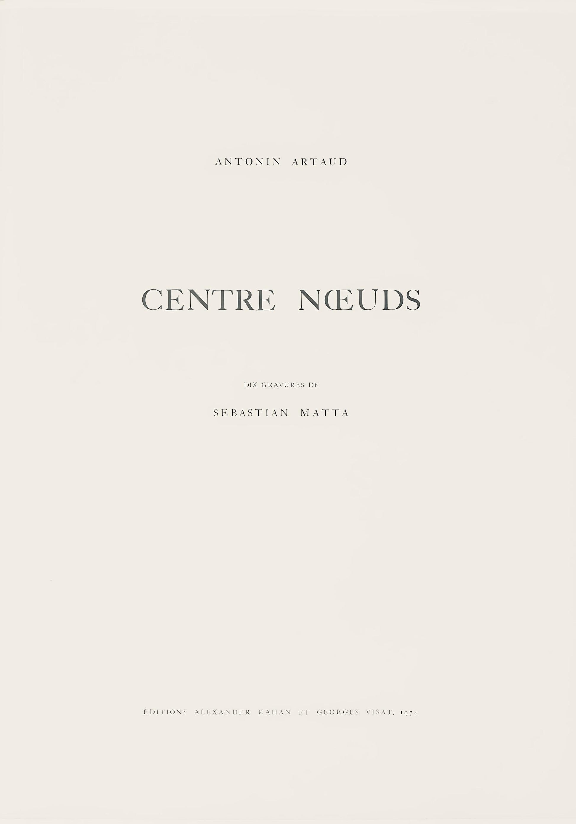 Etching on vlin dArches paper. Paper Size: 23.875 x 17.5 inches. Excellent condition. Inscription: Hand signed and numbered, as issued. Notes: From the folio, Centre Noeuds, 1974. Published by ditions Georges Visat, Paris, and Alexander Kahan, Paris; printed by ditions Georges Visat, Paris, December 18, 1974. Excerpted from the folio (translated from French), The unpublished poem by Antonin Artaud and the X engravings by Sebastin Matta were printed on vlin d'Arches in CXXV examples, numbered from I to CXXV, and XV examples, out of trade, numbered from I to XV. All examples include a suite of etchings signed on Japon nacr. The edition was shot on the hand presses of ditions Georges Visat; the typography in Casion is by Fequet et Baudier; the binding made by the Ateliers Duval. Finished printing in Paris on December 18, 1974.