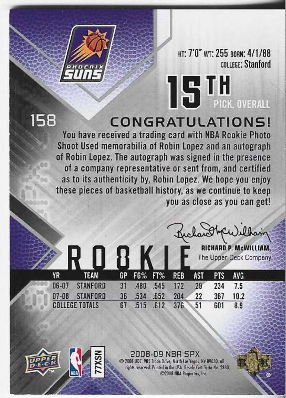 Robin Lopez 2008 Upper Deck Autographed Rookie Relic Card 82/599 #158