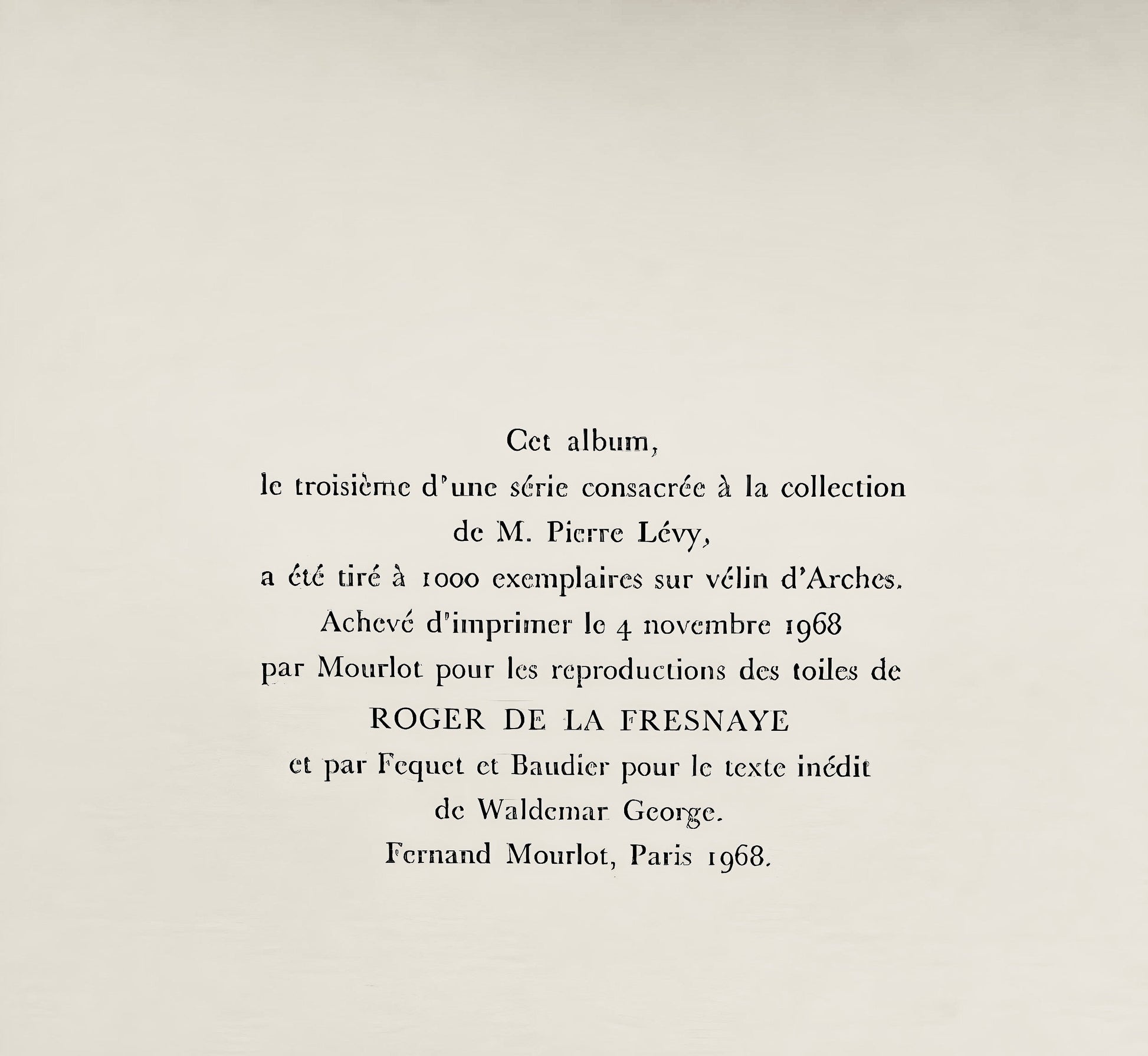 Printing was finished on November 4, 1968 by Mourlot for reproductions of the canvases of Roger de la Fresnaye and by Fequet and Baudier for Waldemar George's unpublished text. Fernand Mourlot, Paris 1968.