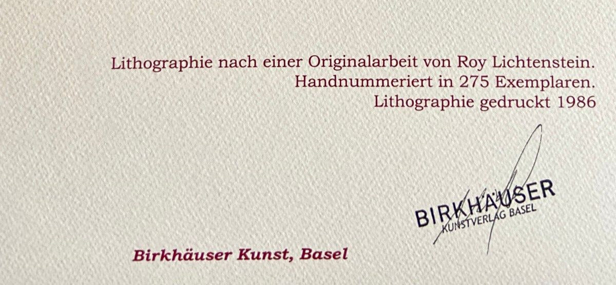 Roy Lichtenstein "Portrait of a girl" Lithograph of an work by Roy Lichtenstein, printed in 1986. 33 x 33 cm 275 hand numbered specimens signed on the slab Birkhuser Kunstverlag, Basel Roy Lichtenstein represents people and objects of everyday life by transforming them into art, extrapolating a scene from its context and giving it a completely renewed meaning, with the insertion of texts and onomatopoeia, in addition to the distinctive dotted effect made through the Ben-Day Dots technique. This is the foundation of the same American pop art, whose artists are inspired by subjects of mass culture and commonly used objects, isolating them from their natural environment to transform them into the new symbols of the consumer society devoted to excess: the same objects were already deeply impressed in the collective imagination, thanks to the pressing advertising that invaded the communications of the main mass media. Lithograph of an work by Roy Lichtenstein, printed in 1986. Roy Lichtenstein represents people and objects of everyday life by transforming them into art, extrapolating a scene from its context and giving it a completely renewed meaning, with the insertion of texts and onomatopoeia, in addition to the distinctive dotted effect made through the Ben-Day Dots technique. This is the foundation of the same American pop art, whose artists are inspired by subjects of mass culture and commonly used objects, isolating them from their natural environment to transform them into the new symbols of the consumer society devoted to excess: the same objects were already deeply impressed in the collective imagination, thanks to the pressing advertising that invaded the communications of t
