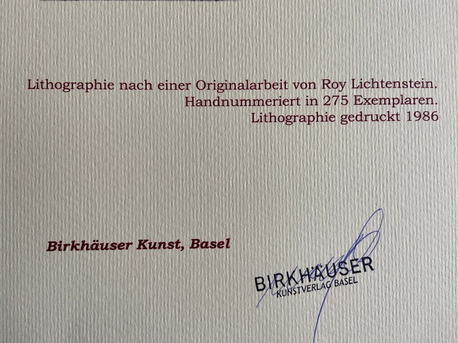 Roy Lichtenstein Lithograph COA (Robert Rauschenberg Robert Indiana) Roy Lichtenstein "Nude with blue hair " Lithograph of an work by Roy Lichtenstein, printed in 1986. 30 x 47 cm 275 hand numbered specimens signed on the slab Birkhuser Kunstverlag, Basel Roy Lichtenstein represents people and objects of everyday life by transforming them into art, extrapolating a scene from its context and giving it a completely renewed meaning, with the insertion of texts and onomatopoeia, in addition to the distinctive dotted effect made through the Ben-Day Dots technique. This is the foundation of the same American pop art, whose artists are inspired by subjects of mass culture and commonly used objects, isolating them from their natural environment to transform them into the new symbols of the consumer society devoted to excess: the same objects were already deeply impressed in the collective imagination, thanks to the pressing advertising that invaded the communications of the main mass media. Lithograph of an work by Roy Lichtenstein, printed in 1986. Roy Lichtenstein represents people and objects of everyday life by transforming them into art, extrapolating a scene from its context and giving it a completely renewed meaning, with the insertion of texts and onomatopoeia, in addition to the distinctive dotted effect made through the Ben-Day Dots technique. This is the foundation of the same American pop art, whose artists are inspired by subjects of mass culture and commonly used objects, isolating them from their natural environment to transform them into the new symbols of the consumer society devoted to excess: the same objects were already deeply impressed in the collective imagination, thanks to the pressing advertising that invaded the communications of t