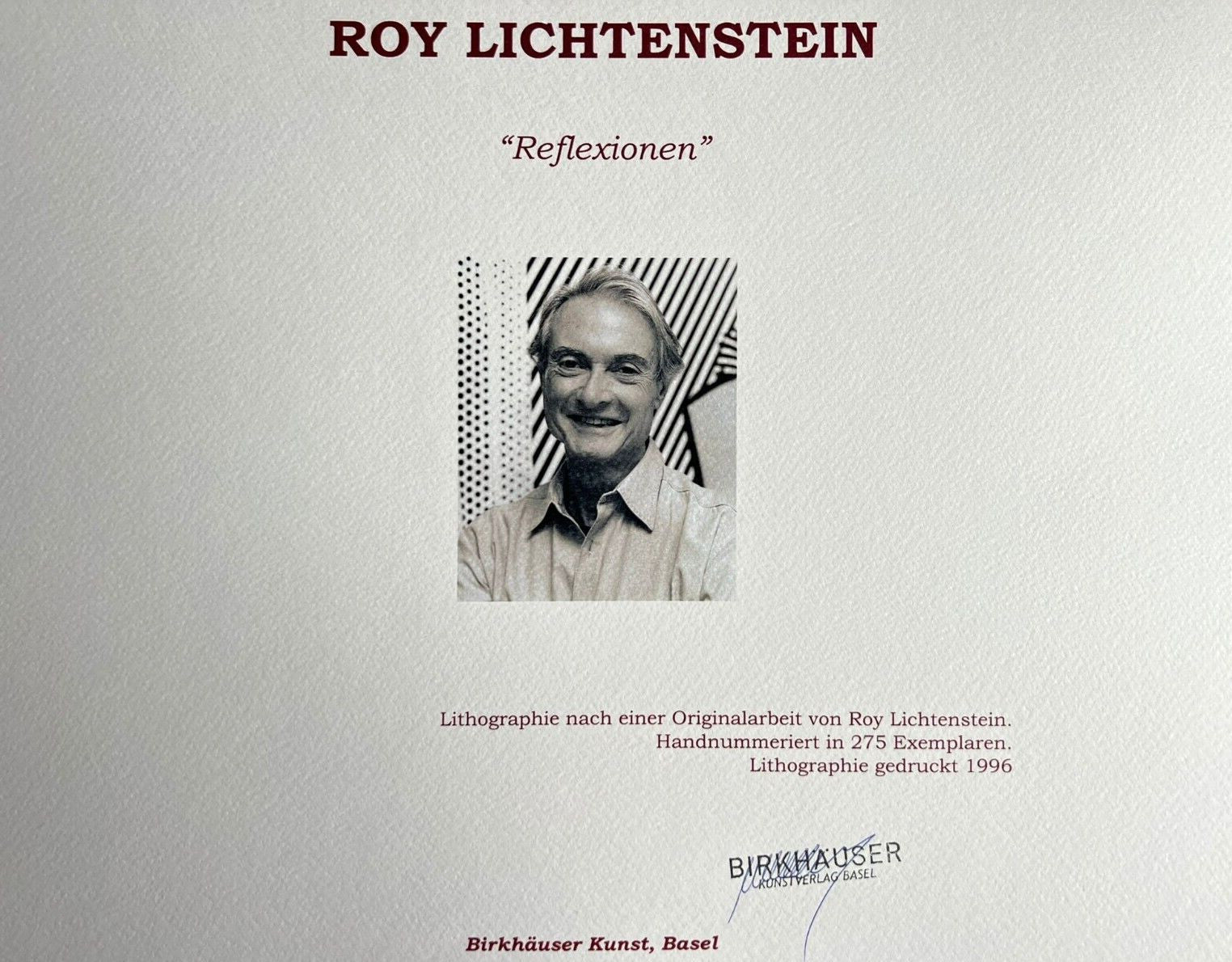 Roy Lichtenstein Lithograph COA: Hand Numbered 275 Exe Roy Lichtenstein "Reflections " Lithograph of an work by Roy Lichtenstein, printed in 1996. 32 x 39 cm 275 hand numbered specimens signed on the slab Birkhuser Kunstverlag, Basel Roy Lichtenstein represents people and objects of everyday life by transforming them into art, extrapolating a scene from its context and giving it a completely renewed meaning, with the insertion of texts and onomatopoeia, in addition to the distinctive dotted effect made through the Ben-Day Dots technique. This is the foundation of the same American pop art, whose artists are inspired by subjects of mass culture and commonly used objects, isolating them from their natural environment to transform them into the new symbols of the consumer society devoted to excess: the same objects were already deeply impressed in the collective imagination, thanks to the pressing advertising that invaded the communications of the main mass media. Lithograph of an work by Roy Lichtenstein, printed in 1996. Roy Lichtenstein represents people and objects of everyday life by transforming them into art, extrapolating a scene from its context and giving it a completely renewed meaning, with the insertion of texts and onomatopoeia, in addition to the distinctive dotted effect made through the Ben-Day Dots technique. This is the foundation of the same American pop art, whose artists are inspired by subjects of mass culture and commonly used objects, isolating them from their natural environment to transform them into the new symbols of the consumer society devoted to excess: the same objects were already deeply impressed in the collective imagination, thanks to the pressing advertising that invaded the communications of t