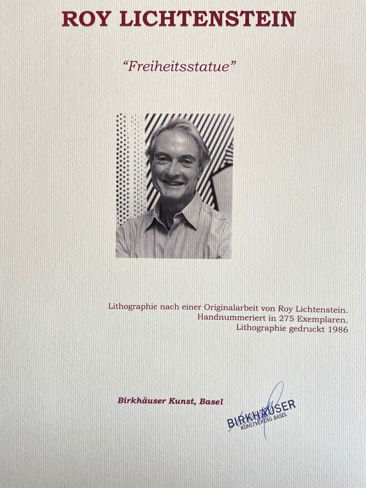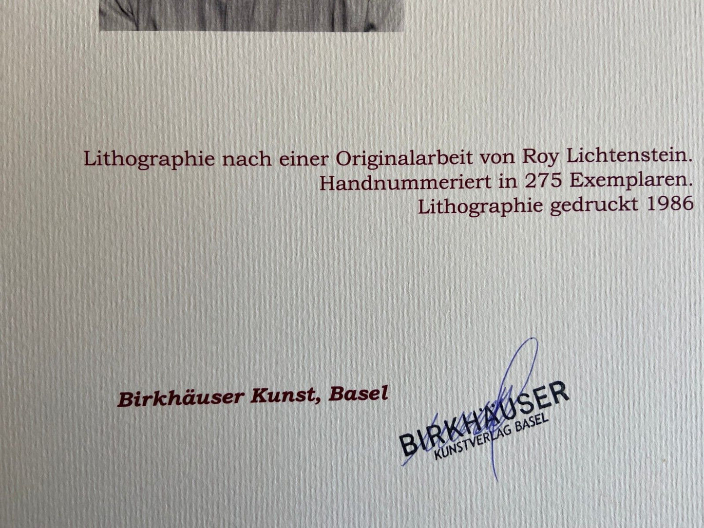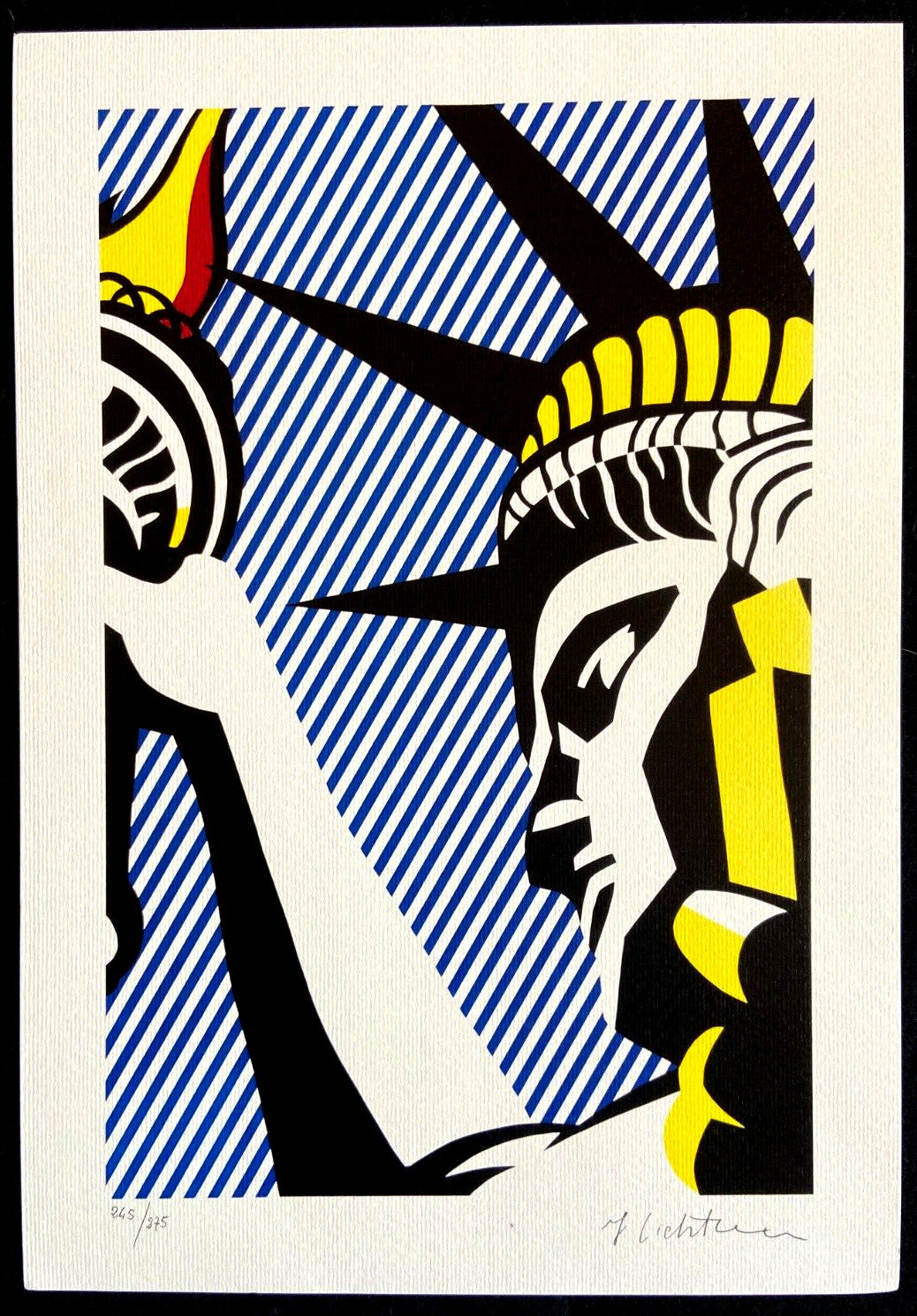 Roy Lichtenstein Lithograph Signed Numbered Limited Edition (KAWS) Roy Lichtenstein "Statue of freedom " Lithograph of an work by Roy Lichtenstein, printed in 1986. 30 x 43 cm 275 hand numbered specimens signed on the plate Birkhuser Kunstverlag, Basel Roy Lichtenstein represents people and everyday objects transforming them into art, extrapolating a scene from its context and giving it a completely renewed meaning, with the inclusion of texts and onomatopoeias, in addition to the distinctive dotted effect created using the Ben-Day dots technique. This is the foundation of American Pop Art itself, whose artists are inspired by subjects of mass culture and objects of common use, isolating them from their natural environment to transform them into the new symbols of the consumerist society devoted to excess: the same objects they were already deeply imprinted in the collective imagination, thanks to the pressing publicity that invaded the communications of the main mass media. Lithograph of an work by Roy Lichtenstein, printed in 1986. Roy Lichtenstein represents people and everyday objects transforming them into art, extrapolating a scene from its context and giving it a completely renewed meaning, with the inclusion of texts and onomatopoeias, in addition to the distinctive dotted effect created using the Ben-Day dots technique. This is the foundation of American Pop Art itself, whose artists are inspired by subjects of mass culture and objects of common use, isolating them from their natural environment to transform them into the new symbols of the consumerist society devoted to excess: the same objects they were already deeply imprinted in the collective imagination, thanks to the pressing publicity that invaded the communications of the ma