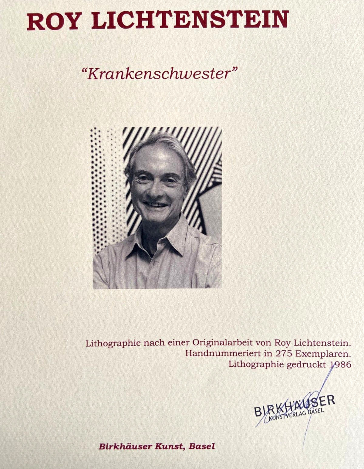 Roy Lichtenstein Lithograph Signed Numbered By Hand 275 Ex @@ Roy Lichtenstein "Nurse " Lithograph of an work by Roy Lichtenstein, printed in 1986. 32 x 32 cm 275 hand numbered specimens signed on the plate Birkhuser Kunstverlag, Basel Roy Lichtenstein represents people and everyday objects transforming them into art, extrapolating a scene from its context and giving it a completely renewed meaning, with the inclusion of texts and onomatopoeias, in addition to the......