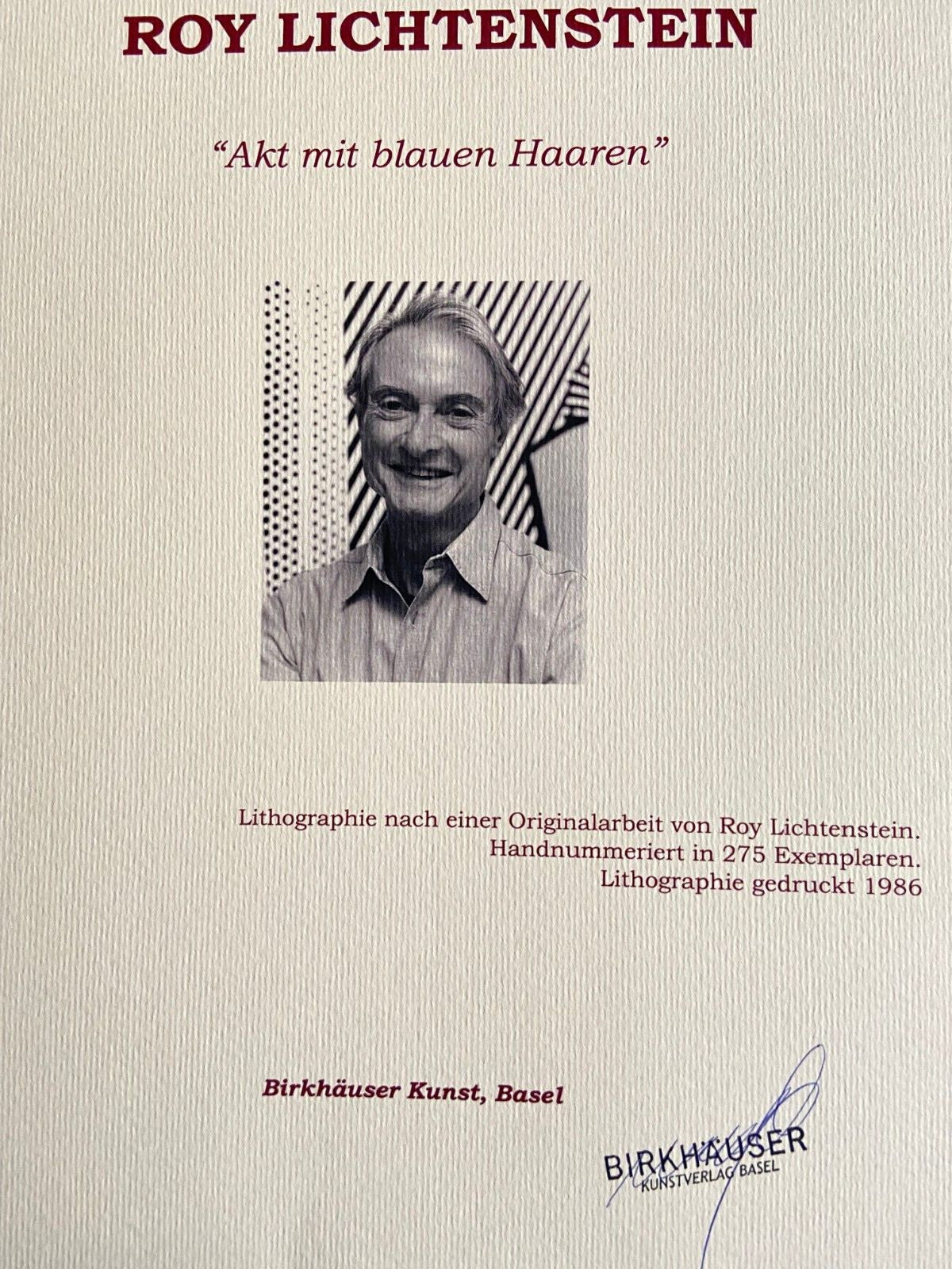 Roy Lichtenstein "Nude aux cheveux bleus " Lithographie d'une uvre e de Roy Lichtenstein, imprime en 1986. 30 x 47 cm 275 spcimens numrots la main Sign sur la dalle Birkhuser Kunstverlag, Ble Roy Lichtenstein reprsente les gens et les objets de la vie quotidienne en les transformant en art, en extrapolant une scne de son contexte d'origine et en lui donnant un sens compltement renouvel, avec l'insertion de textes et d'onomatope, en plus de l'effet pointill distinctif ......