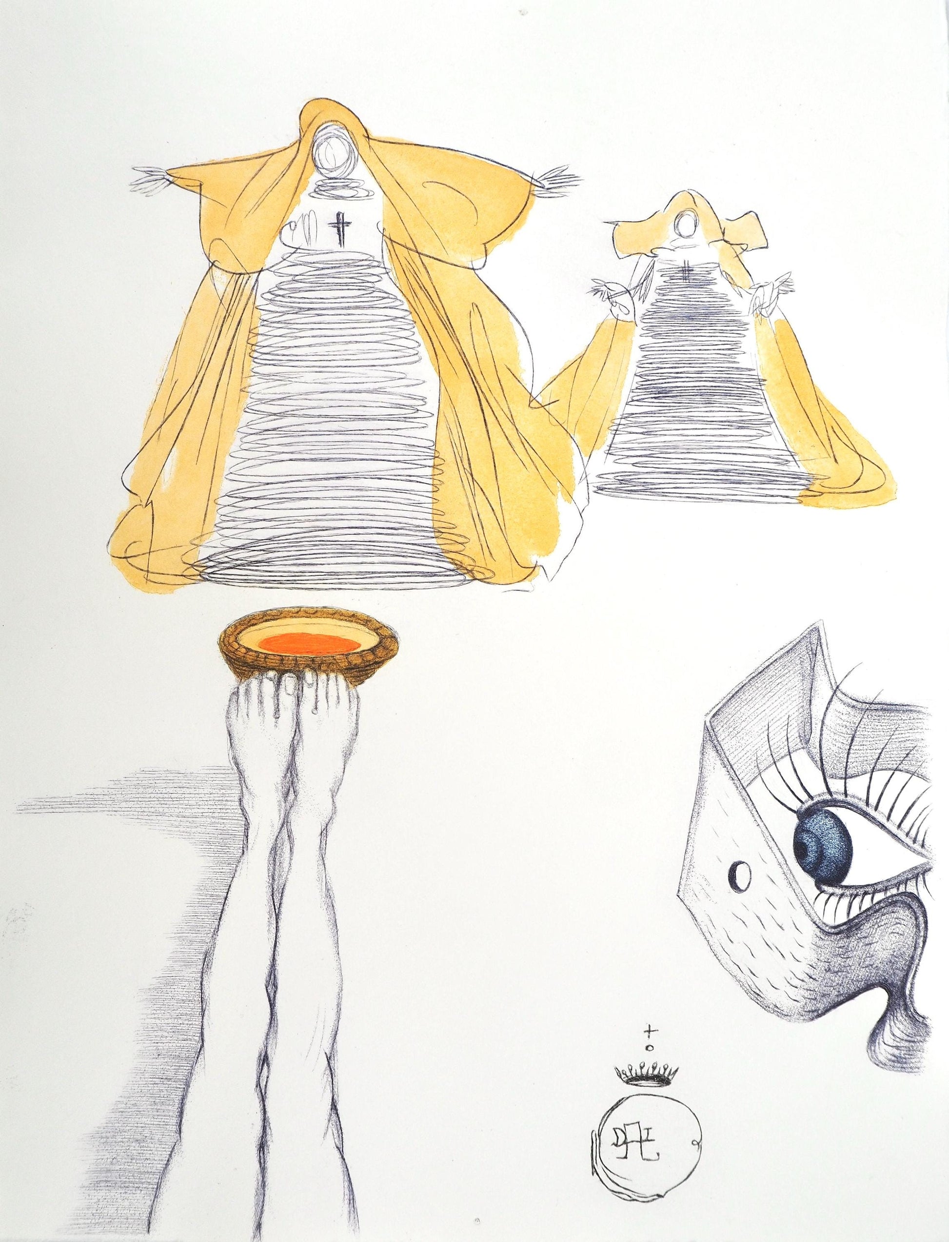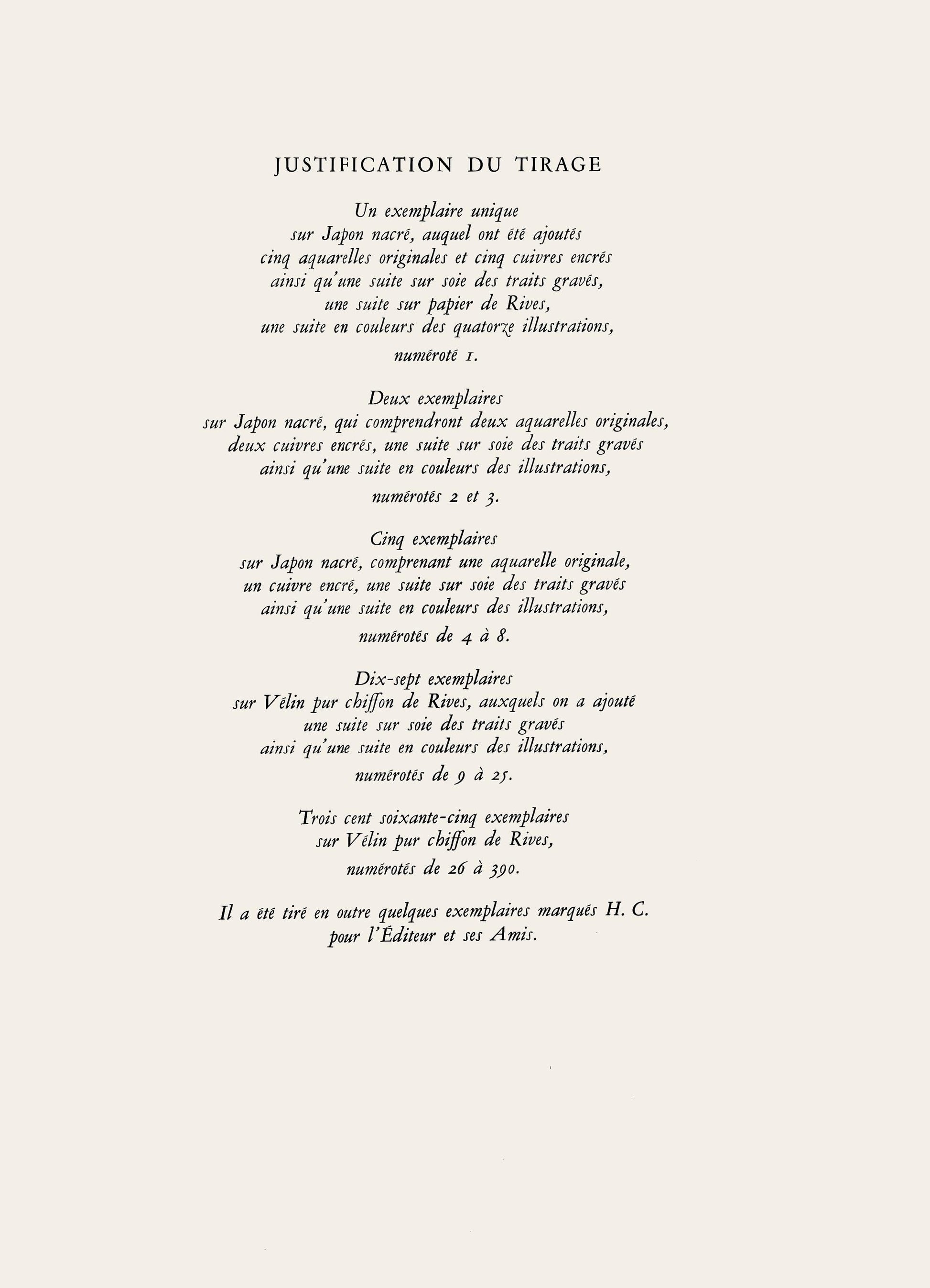 Etching in colors on vlin pur chiffon de Rives paper. Paper Size: 14.875 x 11.25 inches. Excellent condition. Signed in the plate and unnumbered, as issued. Notes: From the folio, Dal illustre Casanova, 1967. Catalogue raisonn reference: Field 67-4; Michler/Lsinger 174-187). Published by Cercle du Livre Prcieux, Paris; printed by Haasen, Boileau and Cappelle, Paris, April 14, 1967. Excerpted from the folio (translated from French), Justification of the draw, A single example on Japon nacr, to which were added V original watercolors and V inked coppers as well as a suite on silk engraved lines, a suite on papier de Rives, a color suite of the XIV illustrations, numbered I. II examples on Japon nacr, which will include II original watercolors, II inked coppers, a silk sequence of engraved strokes and a color sequence of illustrations, numbered II and III. V examples on Japon nacr, including an original watercolor, an inked copper, a silk suite of engraved strokes and a color sequence of illustrations, numbered from IV to VIII. XVII examples on Vlin pur chiffon de Rives, to which we have added a silk suite of engraved strokes as well as a color suite of illustrations, numbered from l to XXV. CCCLXV examples on Vlin pur chiffon de Rives, numbered from XX to CCCXC. In addition, some examples marked H.C. have been drawn for the Publisher and his Friends.