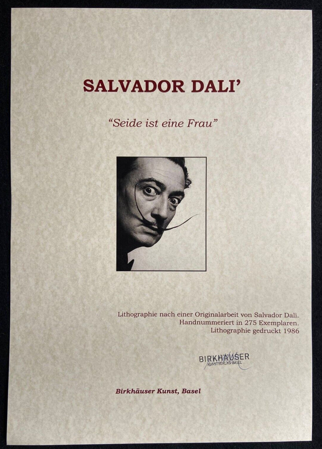 Salvador Dal Lithograph COA Signed Numbered By Hand Salvador Dal "Silk is a woman " Lithograph of an work by Salvador Dal, printed in 1986 30 x 43 cm 275 hand numbered specimens Signature Salvador Dal on the slab The progressive number could be different from the one indicated Birkhuser Kunstverlag, Basel Salvador Dal "Silk is a woman" Lithograph of an work by Salvador Dal, printed in 1986 30 x 43 cm 275 hand numbered specimens Signature Salvador Dalon the slab The progressive number could be different from the one indicated Birkhuser Kunstverlag, Basel