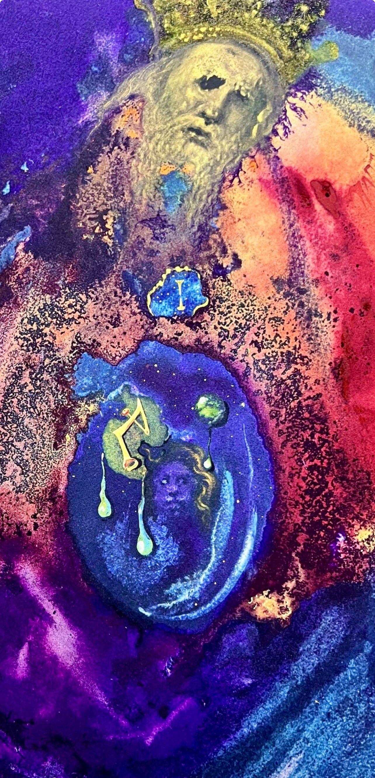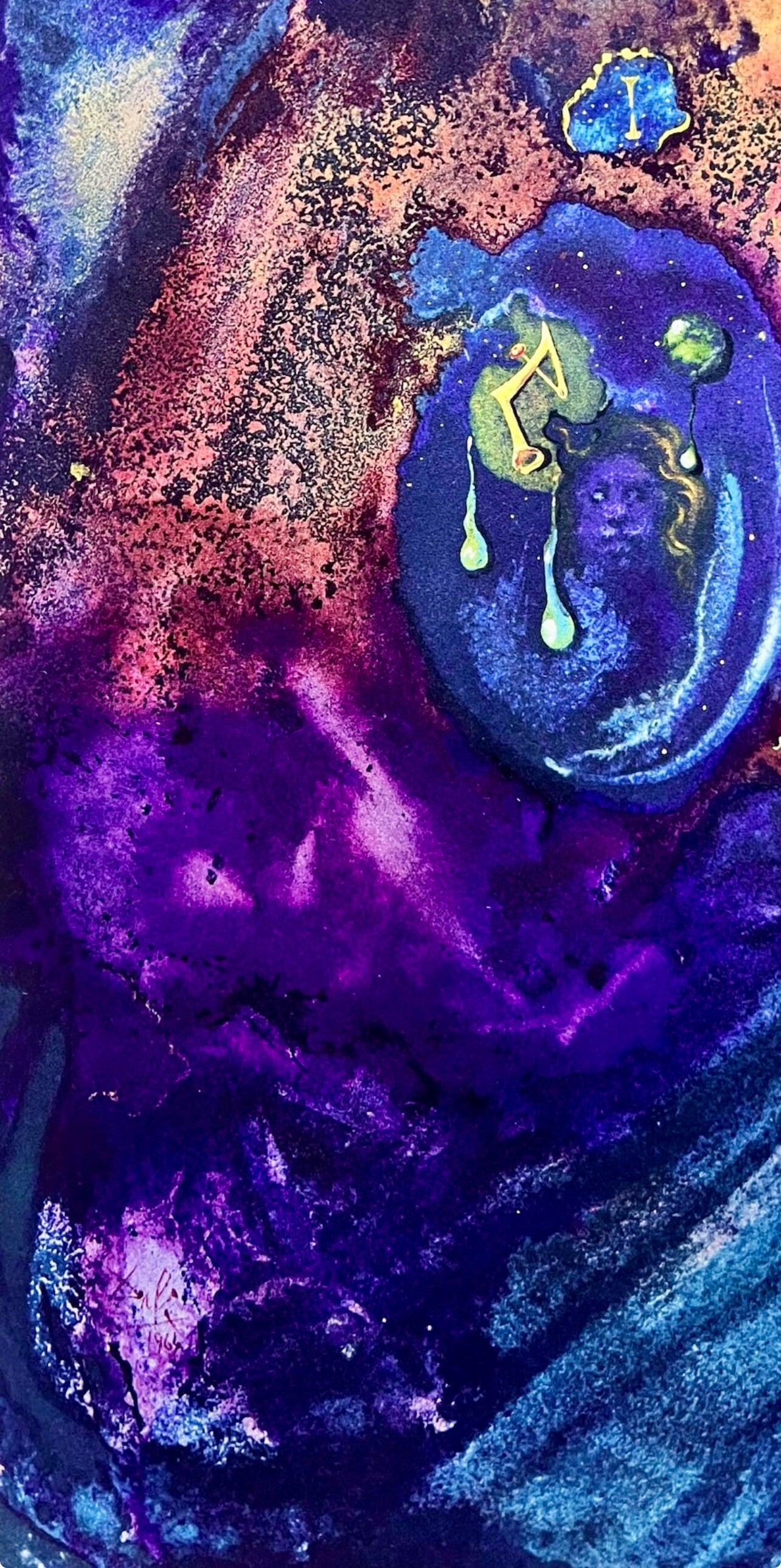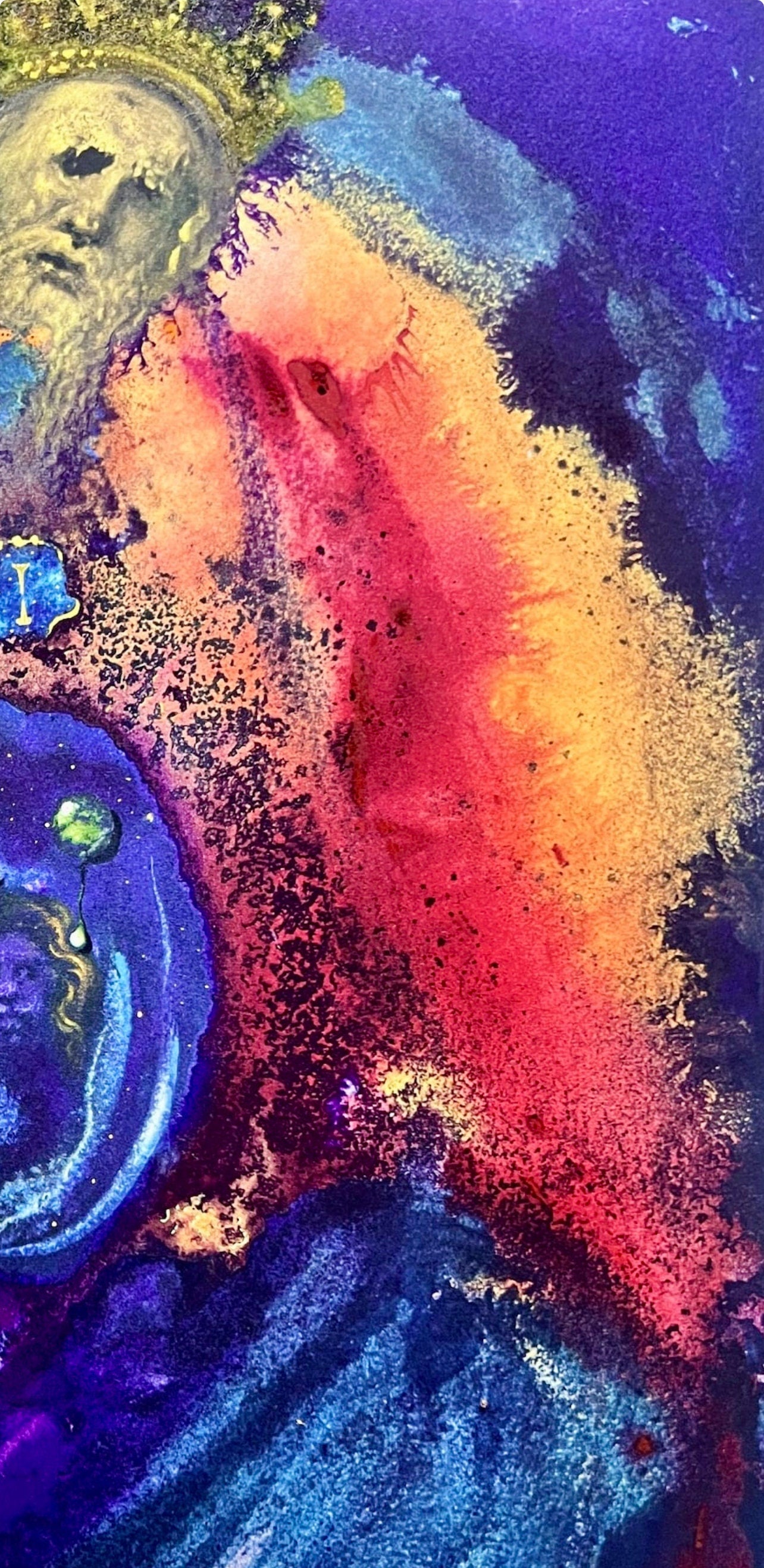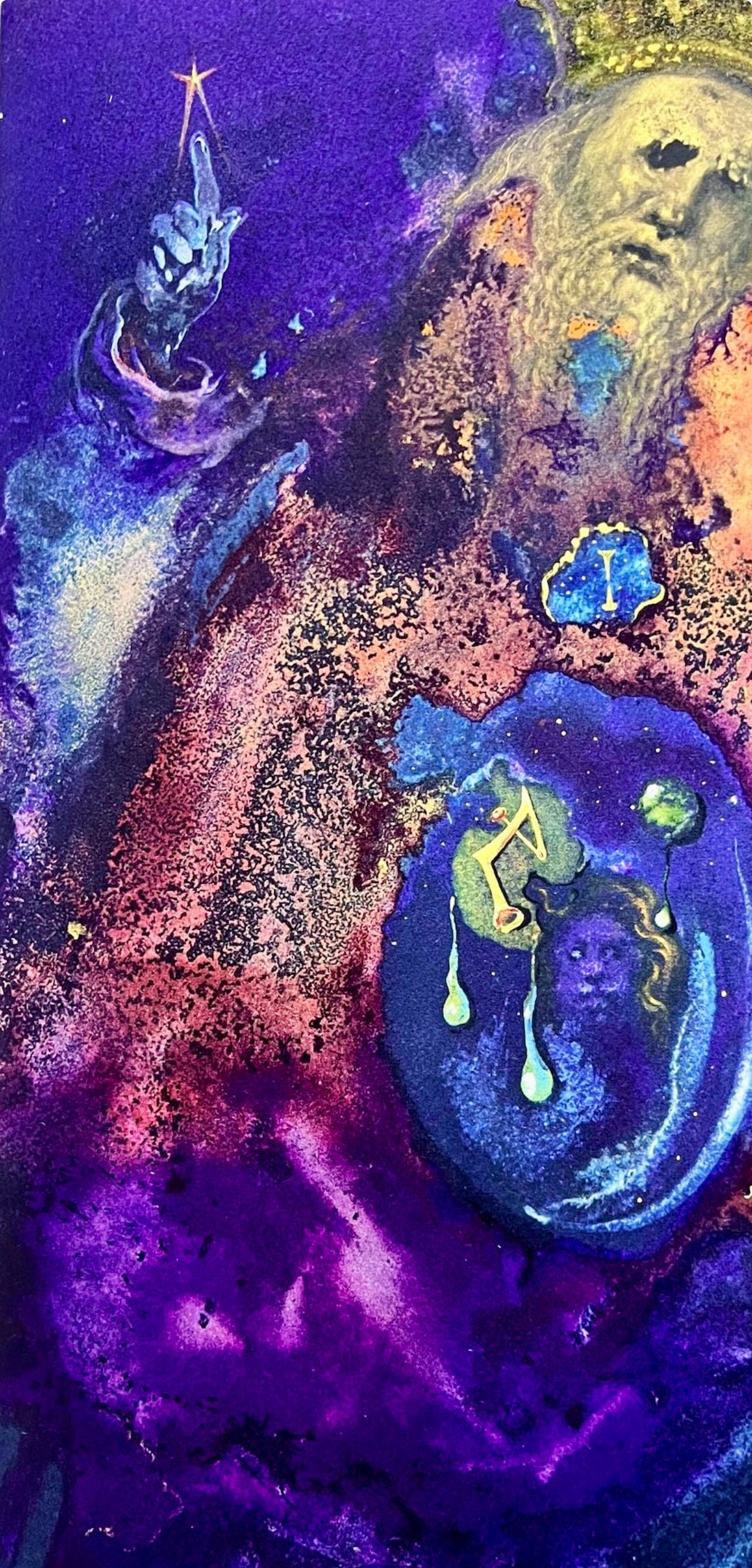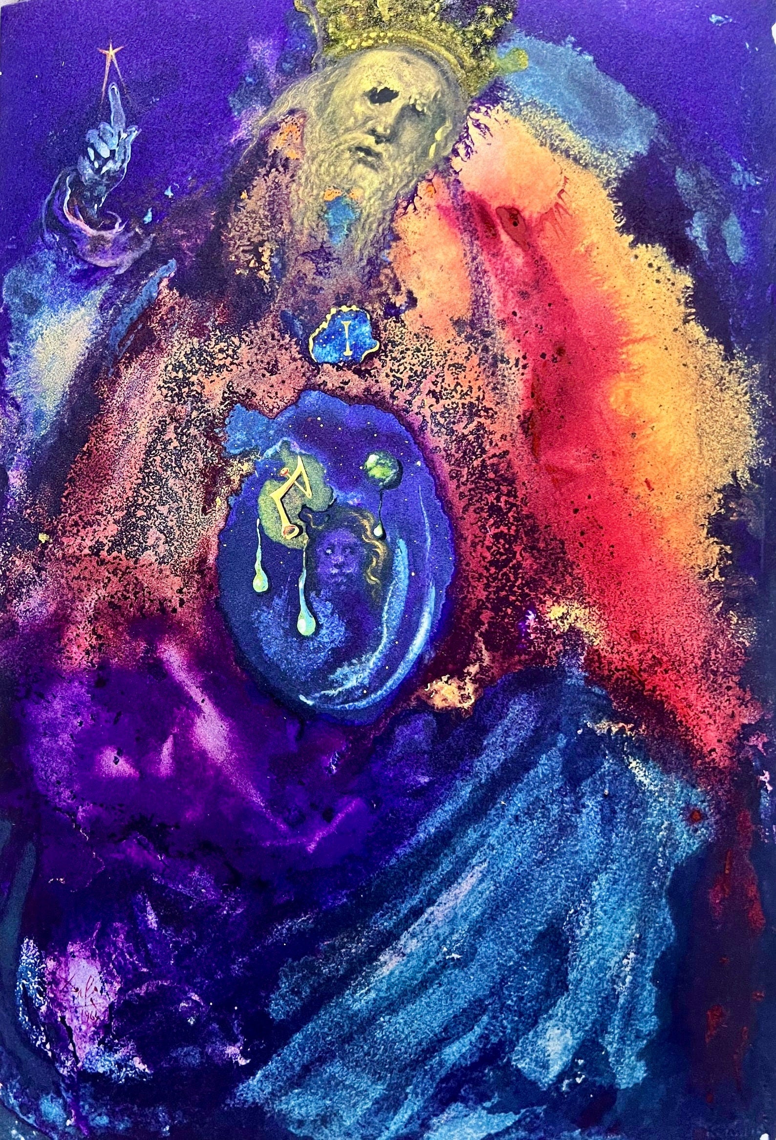 Lithograph in colors on Fabriano hand-made, rag, cream laid paper. Paper Size: 19.375 x 14.375 inches. Excellent condition. Inscription: Unsigned and unnumbered, as issued. Catalogue Raisonne Reference: Michler/Lpsinger 1600; Field 69-3. Notes: From the volume, Biblia Sacra, 1967. Published by Rizzoli-Mediolani, Milan, and Giuseppe Albaretto, Port Lligat; printed by Graphic Workshop of Rizzoli-Mediolani, Milan, 1967. Excerpted from the volume (translated from Latin), Under the unique and personal direction and supervision of the publisher, this work, divided into five volumes, was entirely and exclusively produced in the Graphic Workshop of Rizzoli-Mediolani under the supervision of Peter Raggi and assisted by Peter Volont and Iohanne Charles Penna, was brought to effect. The form of letters, derived from certain cradles of Aldi Manutius, was drawn up and shot again for this very purpose. The prints of this work were ordered: XCIX examples "ab alveo", each with an original painting by Salvador Dal, on which they were printed on paper made from pure rags "from the canal" by hand, woven with transparent figures, and covered and compacted with a green wash, commonly known as "maro-chinum," decorated with gold ornaments and painted on the back dorso picta. CXCIX examples in a sumptuous "luxury" edition in Roman Numerals, distinguished from I to MCDXCIX, likewise printed on paper made of mere cloth "ab alveo" by hand, woven with transparent figures, and covered with green cloth covered with gold ornaments, painted like a mosaic on the back. MCDXCIX examples, beautiful "luxus" edition, Arabic numerals distinguished from I to MCDXCIX, printed on a special colored paper and woven with transparent figures, covered with leather ca first skin color exibente, with golden ornaments.