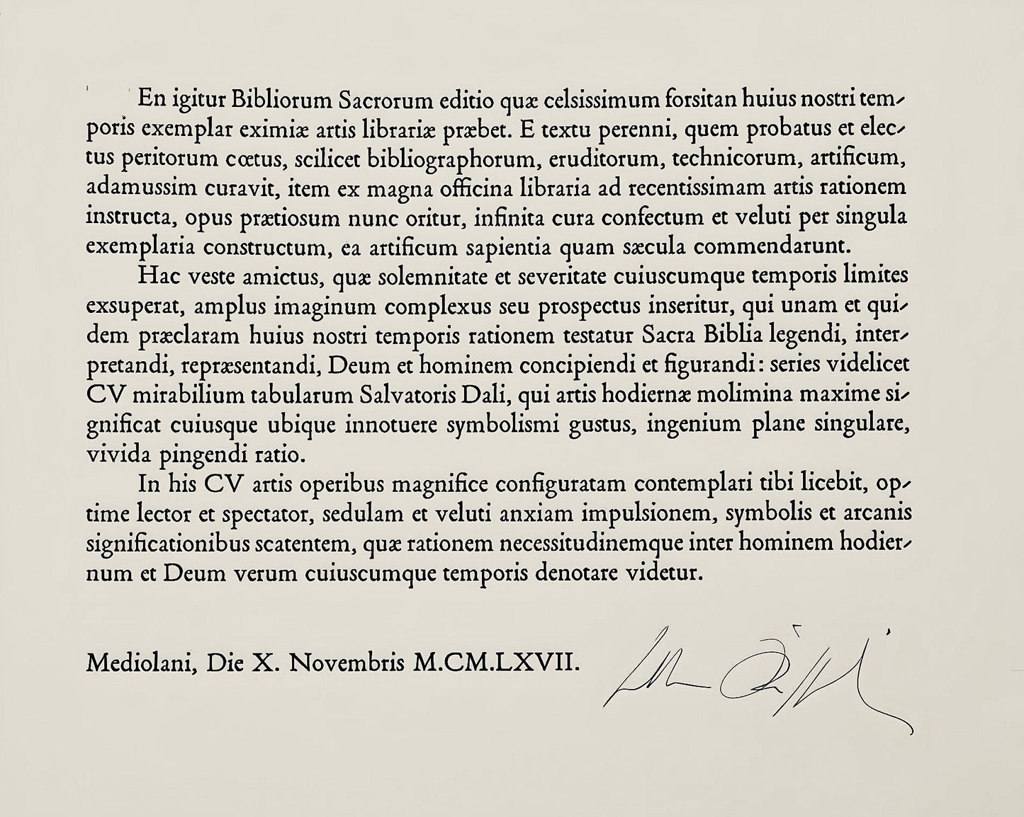 Lithograph in colors on Fabriano hand-made, rag, cream laid paper. Paper Size: 14.375 x 19.375 inches. Excellent condition. Inscription: Unsigned and unnumbered, as issued. Catalogue Raisonne Reference: Michler/Lpsinger 1600; Field 69-3. Notes: From the volume, Biblia Sacra, 1967. Published by Rizzoli-Mediolani, Milan, and Giuseppe Albaretto, Port Lligat; printed by Graphic Workshop of Rizzoli-Mediolani, Milan, 1967. Excerpted from the volume (translated from Latin), Under the unique and personal direction and supervision of the publisher, this work, divided into five volumes, was entirely and exclusively produced in the Graphic Workshop of Rizzoli-Mediolani under the supervision of Peter Raggi and assisted by Peter Volont and Iohanne Charles Penna, was brought to effect. The form of letters, derived from certain cradles of Aldi Manutius, was drawn up and shot again for this very purpose. The prints of this work were ordered: XCIX examples "ab alveo", each with an original painting by Salvador Dal, on which they were printed on paper made from pure rags "from the canal" by hand, woven with transparent figures, and covered and compacted with a green wash, commonly known as "maro-chinum," decorated with gold ornaments and painted on the back dorso picta. CXCIX examples in a sumptuous "luxury" edition in Roman Numerals, distinguished from I to MCDXCIX, likewise printed on paper made of mere cloth "ab alveo" by hand, woven with transparent figures, and covered with green cloth covered with gold ornaments, painted like a mosaic on the back. MCDXCIX examples, beautiful "luxus" edition, Arabic numerals distinguished from I to MCDXCIX, printed on a special colored paper and woven with transparent figures, covered with leather ca first skin color exibente, with golden ornaments.