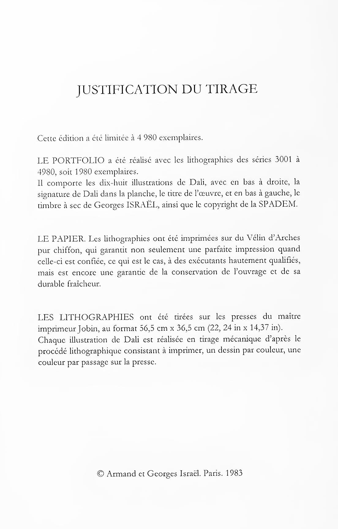 It includes the eighteen illustrations of Dali, with at the bottom right, Dali's signature on the board, the title of the work, and at the bottom left, the dry stamp of Georges Isral, as well as the copyright of the S.P.A.D.E.M.