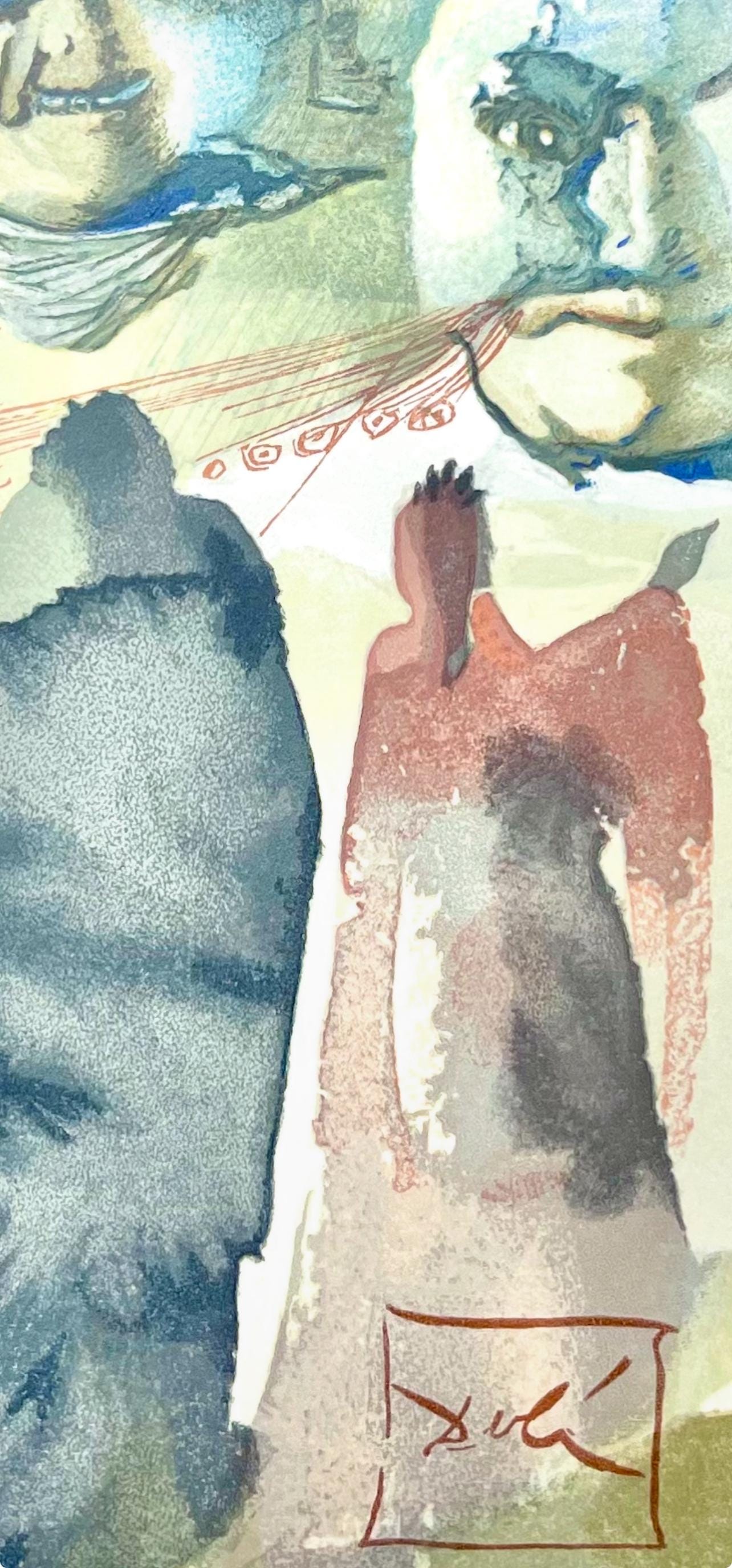 Woodcut in colors on vlin de Rives BFK paper, mounted on vlin dArches support, as issued. Paper size: 13 x 10.375 inches. Excellent condition. Inscription: Signed in the block, and unnumbered, as issued. Catalogue raisonn reference: Michler & Lpsinger 1039-1138; Field 189-200. Notes: From the folio, Die Gttliche Komdie, 1974. Published by Art-Crations-Bibliophile, Geneva, under the direction of Jawdat Naffouj, Landstuhl; printed by Ateliers Jacquet et Taricco, Paris, 1974. Excerpted from the folio (translated from German), The current edition of Salvador Dali's illustrations for Dante's, Gttliche Komdie was published for the German-speaking countries and shot in M examples, limited.