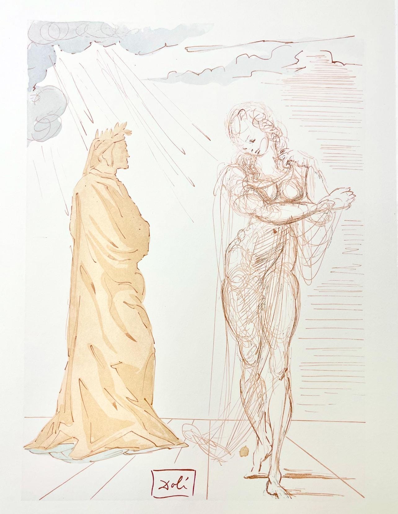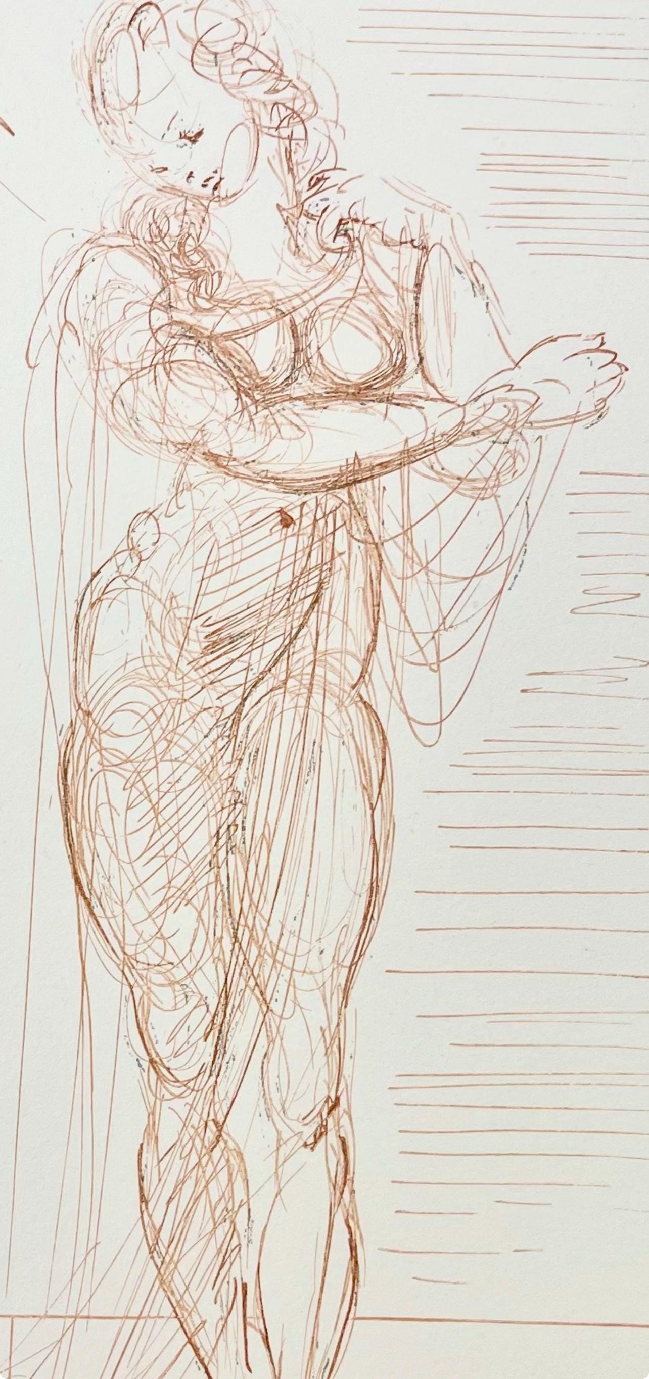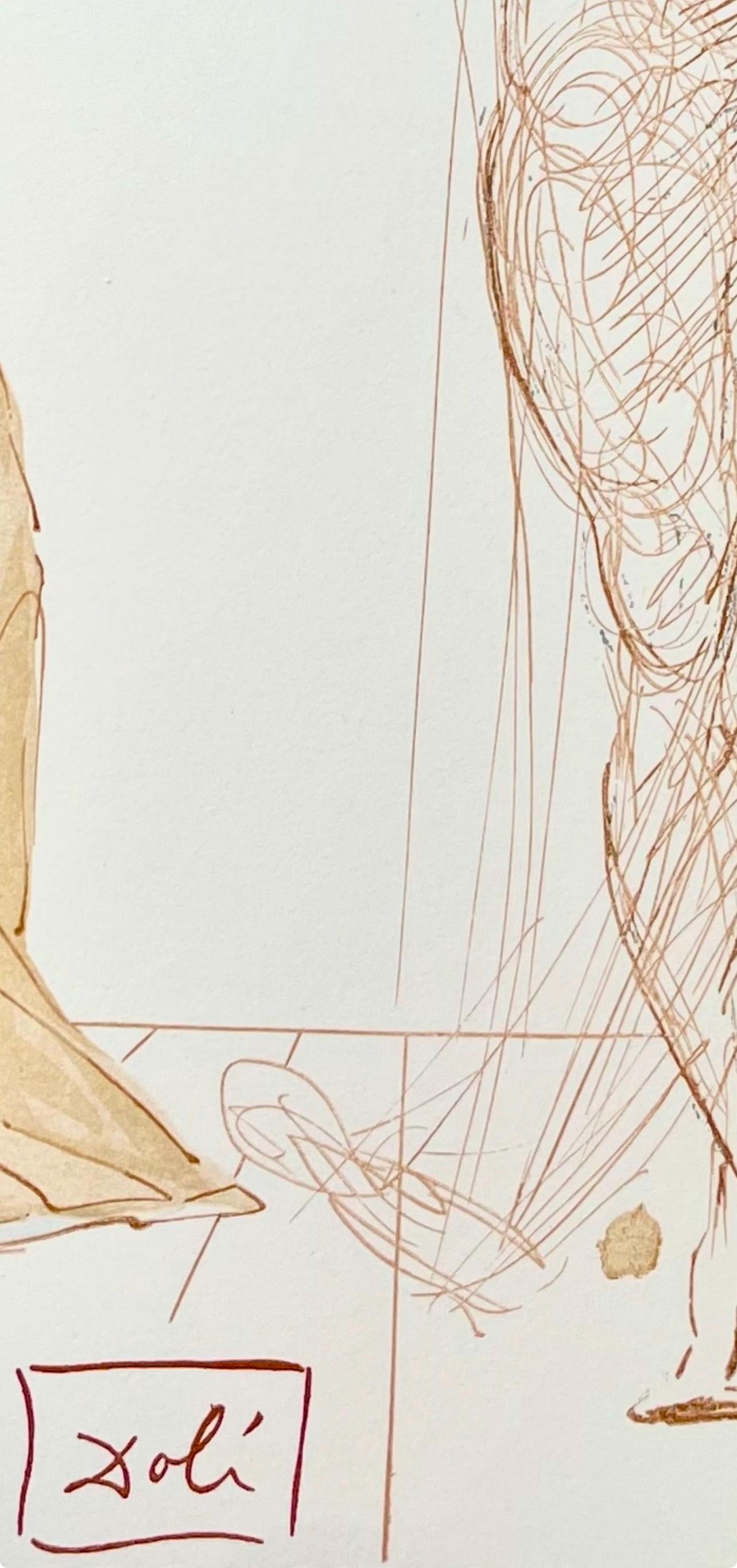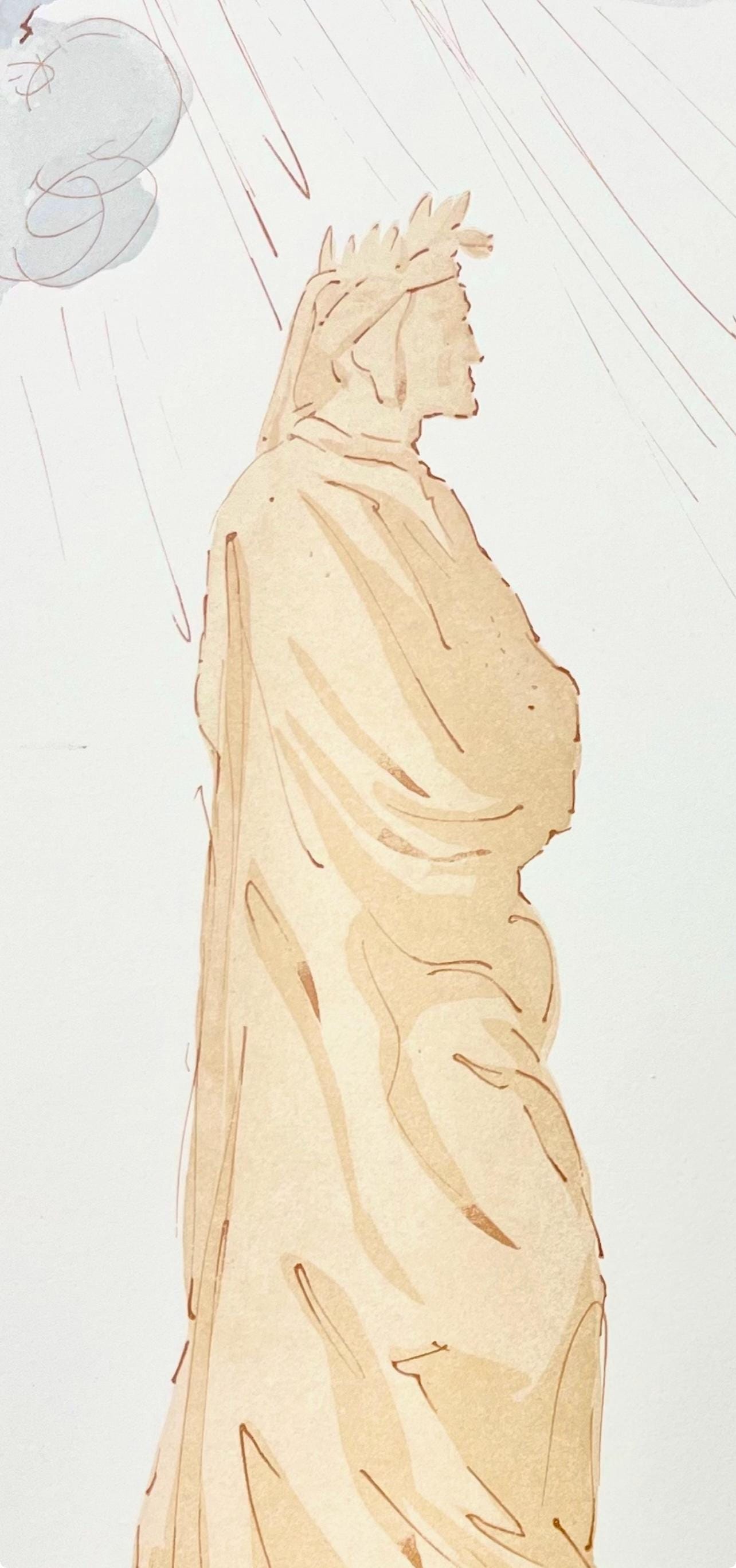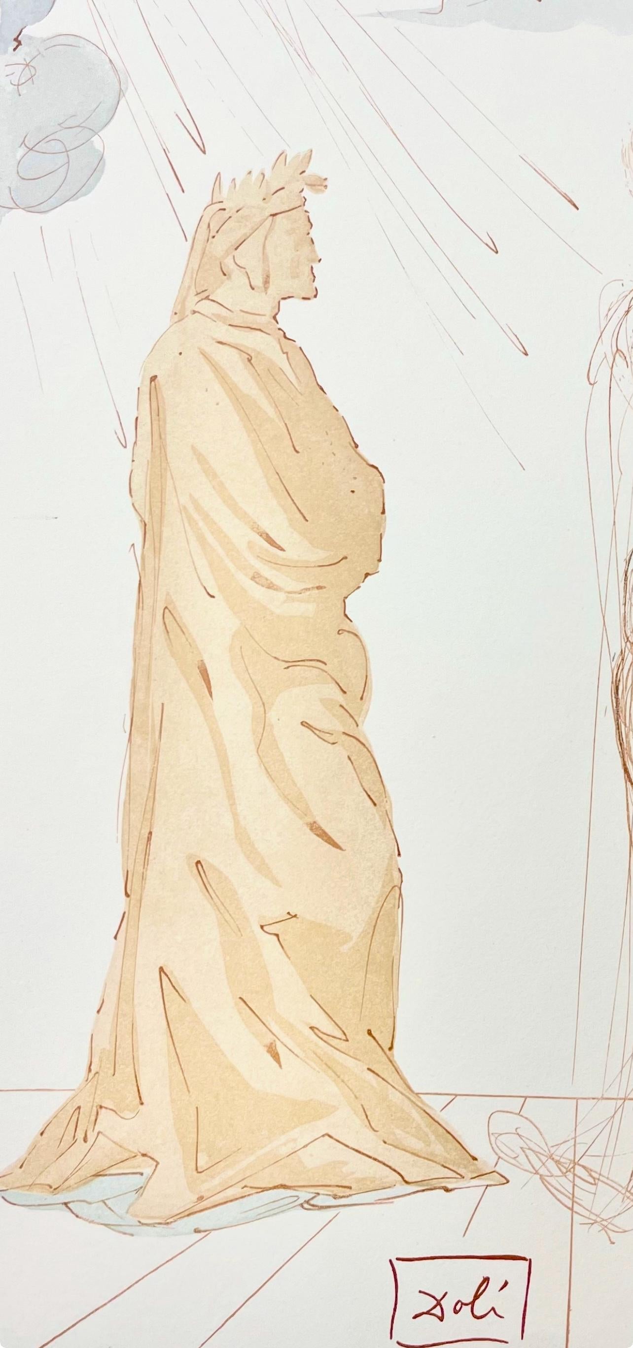 Woodcut in colors on vlin de Rives BFK paper, mounted on vlin dArches support, as issued. Paper size: 13 x 10.375 inches. Excellent condition. Inscription: Signed in the block, and unnumbered, as issued. Catalogue raisonn reference: Michler & Lpsinger 1039-1138; Field 189-200. Notes: From the folio, Die Gttliche Komdie, 1974. Published by Art-Crations-Bibliophile, Geneva, under the direction of Jawdat Naffouj, Landstuhl; printed by Ateliers Jacquet et Taricco, Paris, 1974. Excerpted from the folio (translated from German), The current edition of Salvador Dali's illustrations for Dante's, Gttliche Komdie was published for the German-speaking countries and shot in M examples, limited.