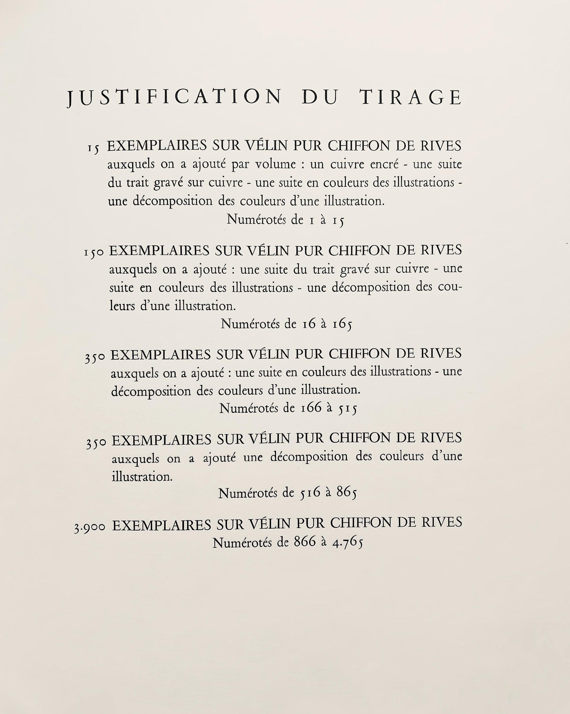 Justification of the Draw: XV examples on vlin pur chiffon de Rives to which we have added by volume: an inked copper - a sequence of the line engraved on copper - a color suite of the illustrations - a decomposition of the colors of an illustration.