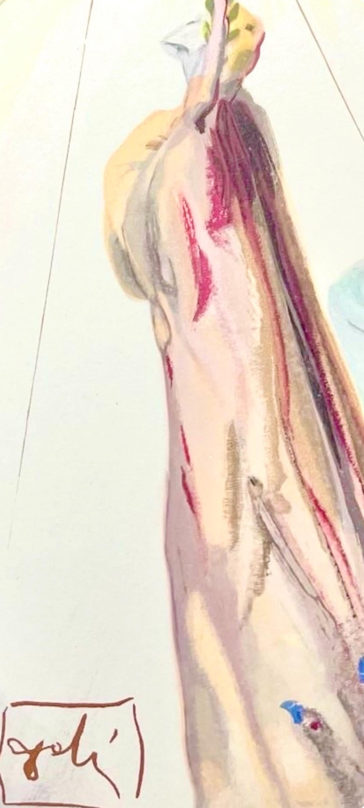 Woodcut in colors on vlin de Rives BFK paper, mounted on vlin dArches support, as issued. Paper size: 13 x 10.375 inches. Excellent condition. Inscription: Signed in the block, and unnumbered, as issued. Catalogue raisonn reference: Michler & Lpsinger 1039-1138; Field 189-200. Notes: From the folio, Die Gttliche Komdie, 1974. Published by Art-Crations-Bibliophile, Geneva, under the direction of Jawdat Naffouj, Landstuhl; printed by Ateliers Jacquet et Taricco, Paris, 1974. Excerpted from the folio (translated from German), The current edition of Salvador Dali's illustrations for Dante's, Gttliche Komdie was published for the German-speaking countries and shot in M examples, limited.