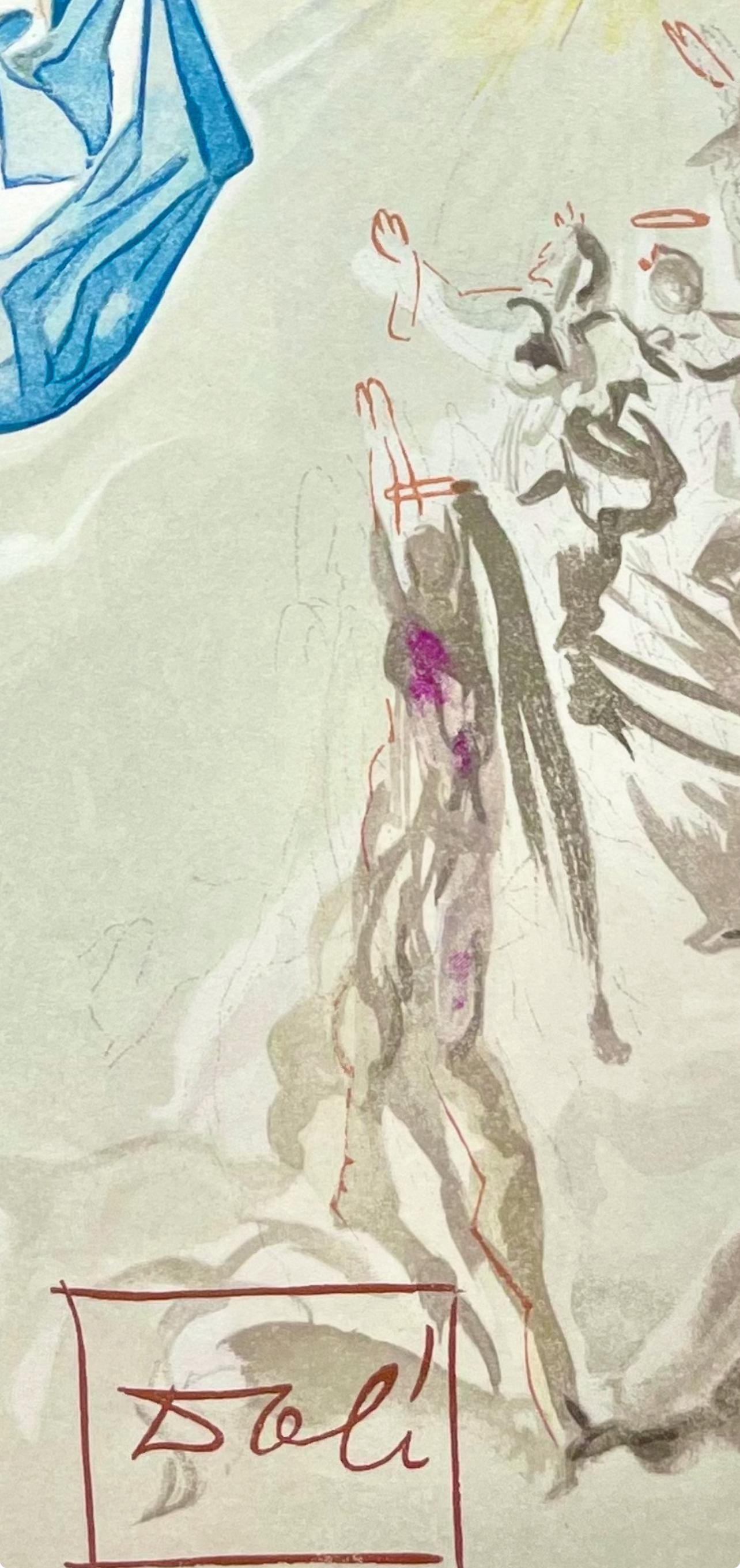 Woodcut in colors on vlin de Rives BFK paper, mounted on vlin dArches support, as issued. Paper size: 13 x 10.375 inches. Excellent condition. Inscription: Signed in the block, and unnumbered, as issued. Catalogue raisonn reference: Michler & Lpsinger 1039-1138; Field 189-200. Notes: From the folio, Die Gttliche Komdie, 1974. Published by Art-Crations-Bibliophile, Geneva, under the direction of Jawdat Naffouj, Landstuhl; printed by Ateliers Jacquet et Taricco, Paris, 1974. Excerpted from the folio (translated from German), The current edition of Salvador Dali's illustrations for Dante's, Gttliche Komdie was published for the German-speaking countries and shot in M examples, limited.