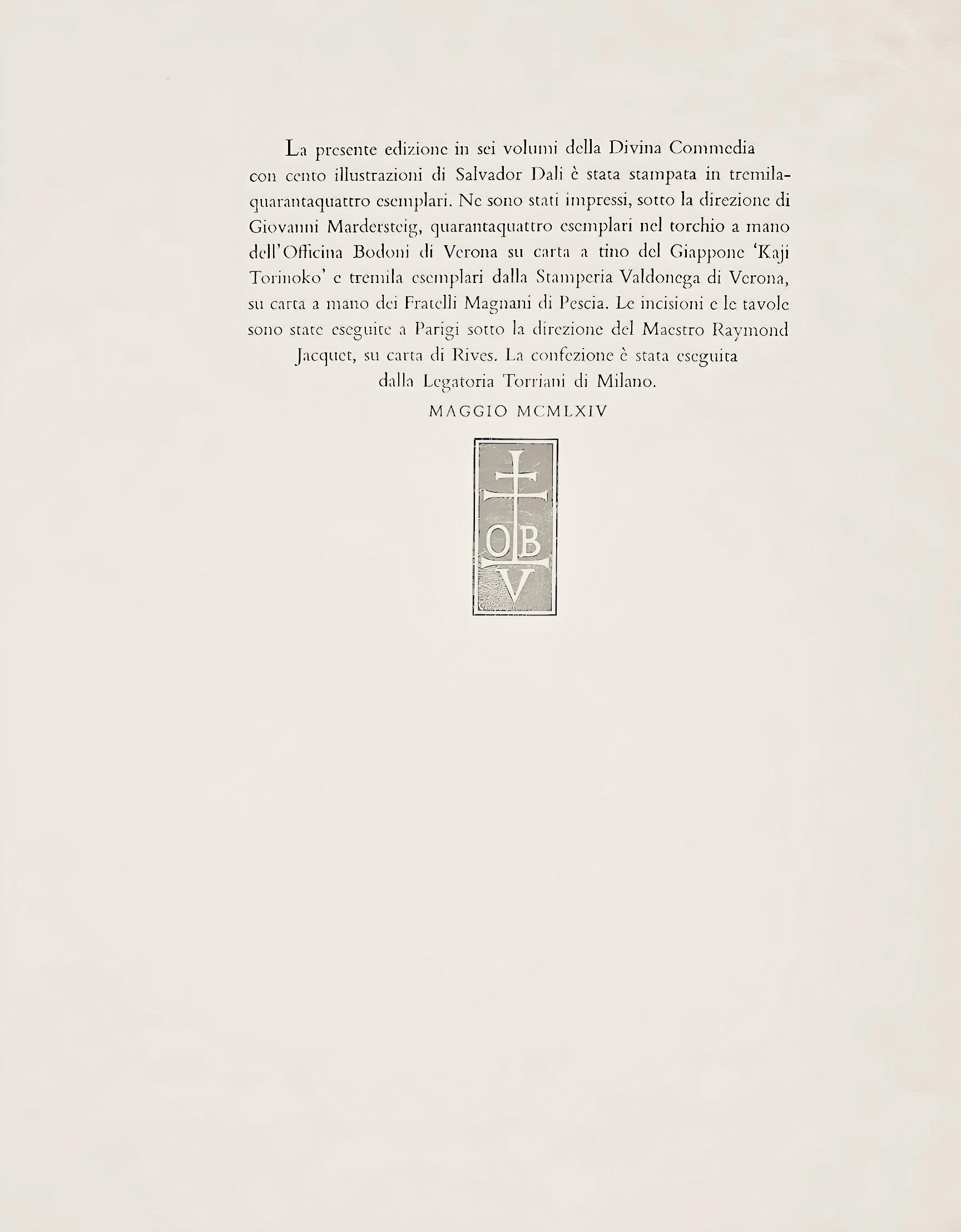 Excerpted from the folio (translated from Italian), This VI-folio edition of the Divina Commedia, with C illustrations by Salvador Dal, has been printed in MMMXLIV examples.