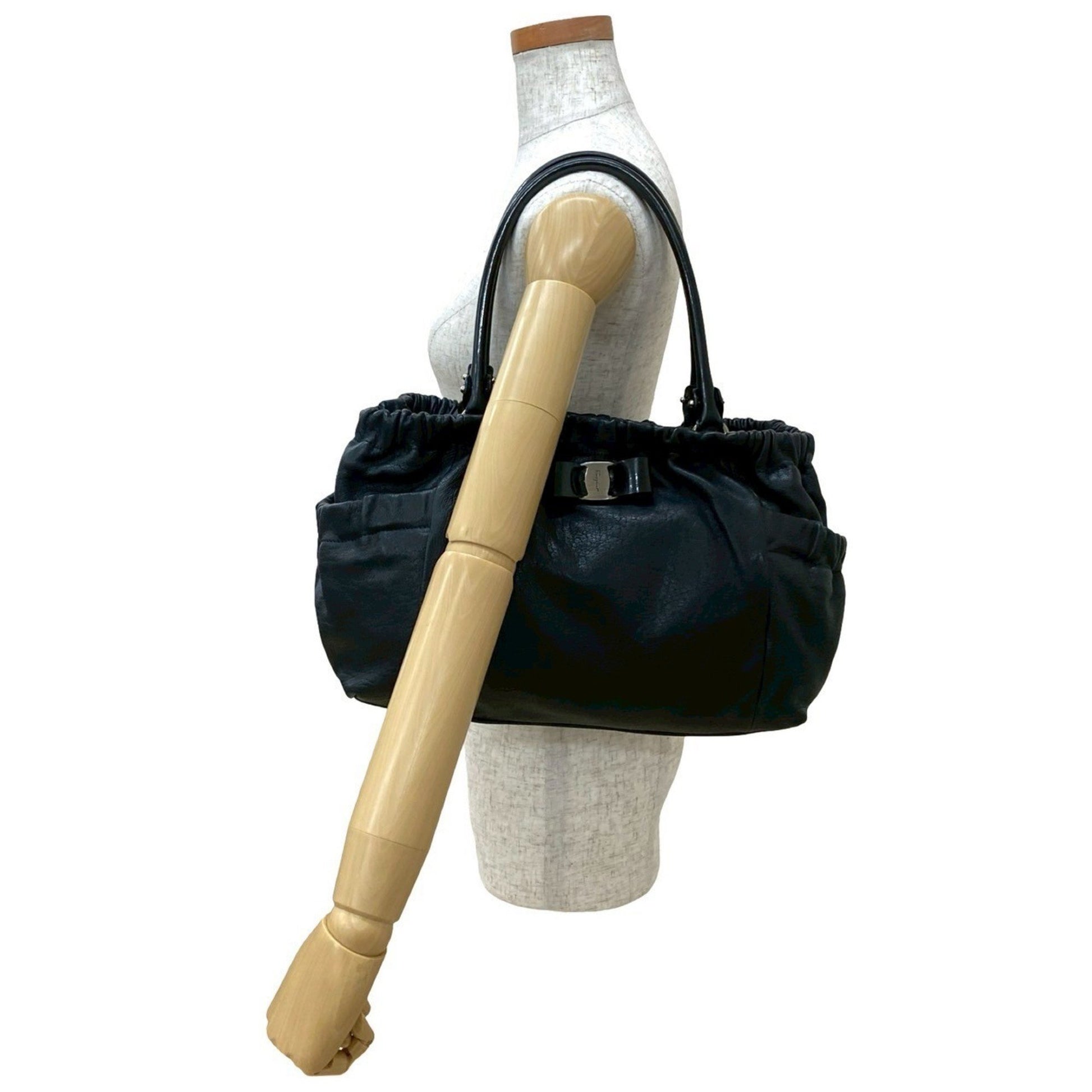 Salvatore Ferragamo Vara Ribbon Logo Hardware Leather Handbag Tote Bag Black 31299