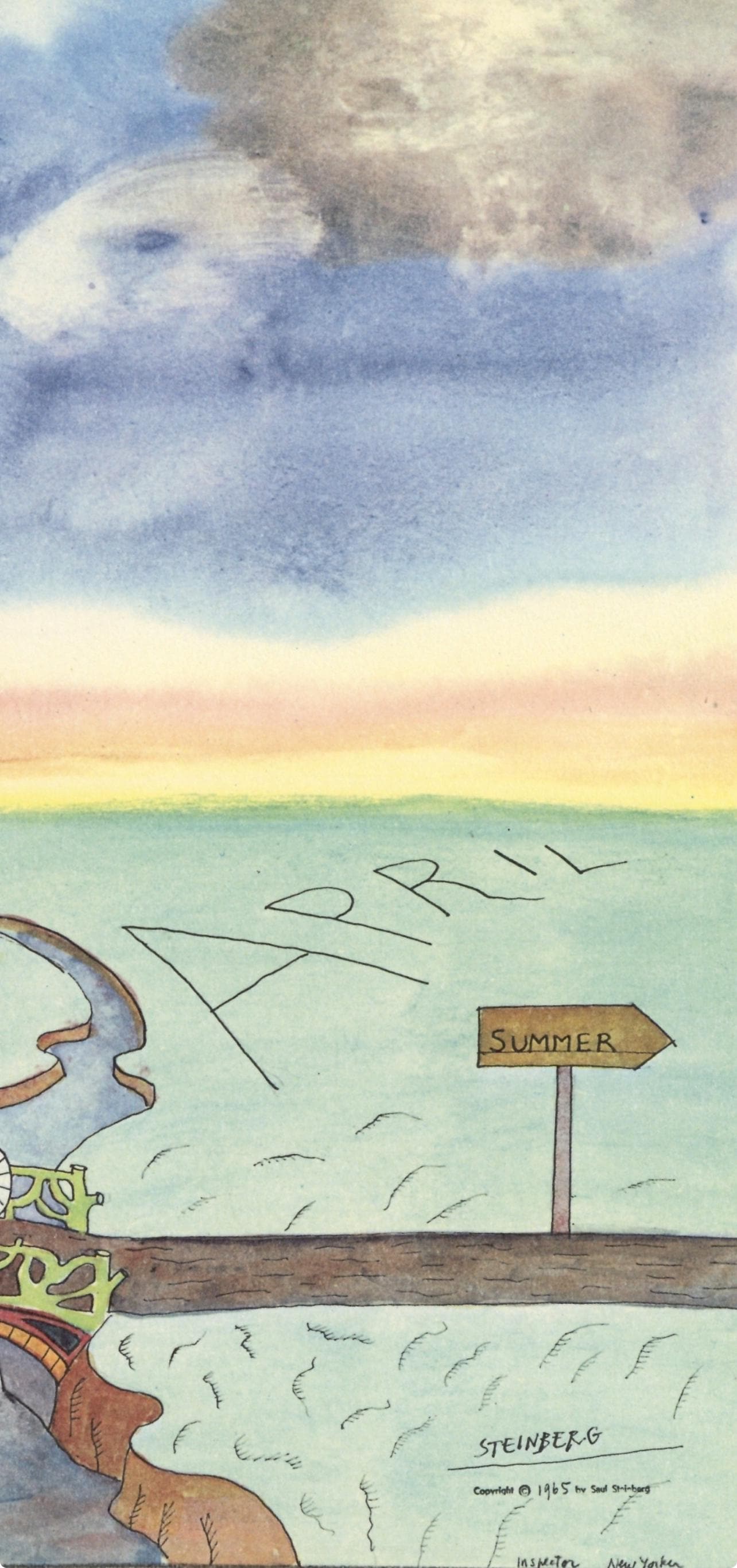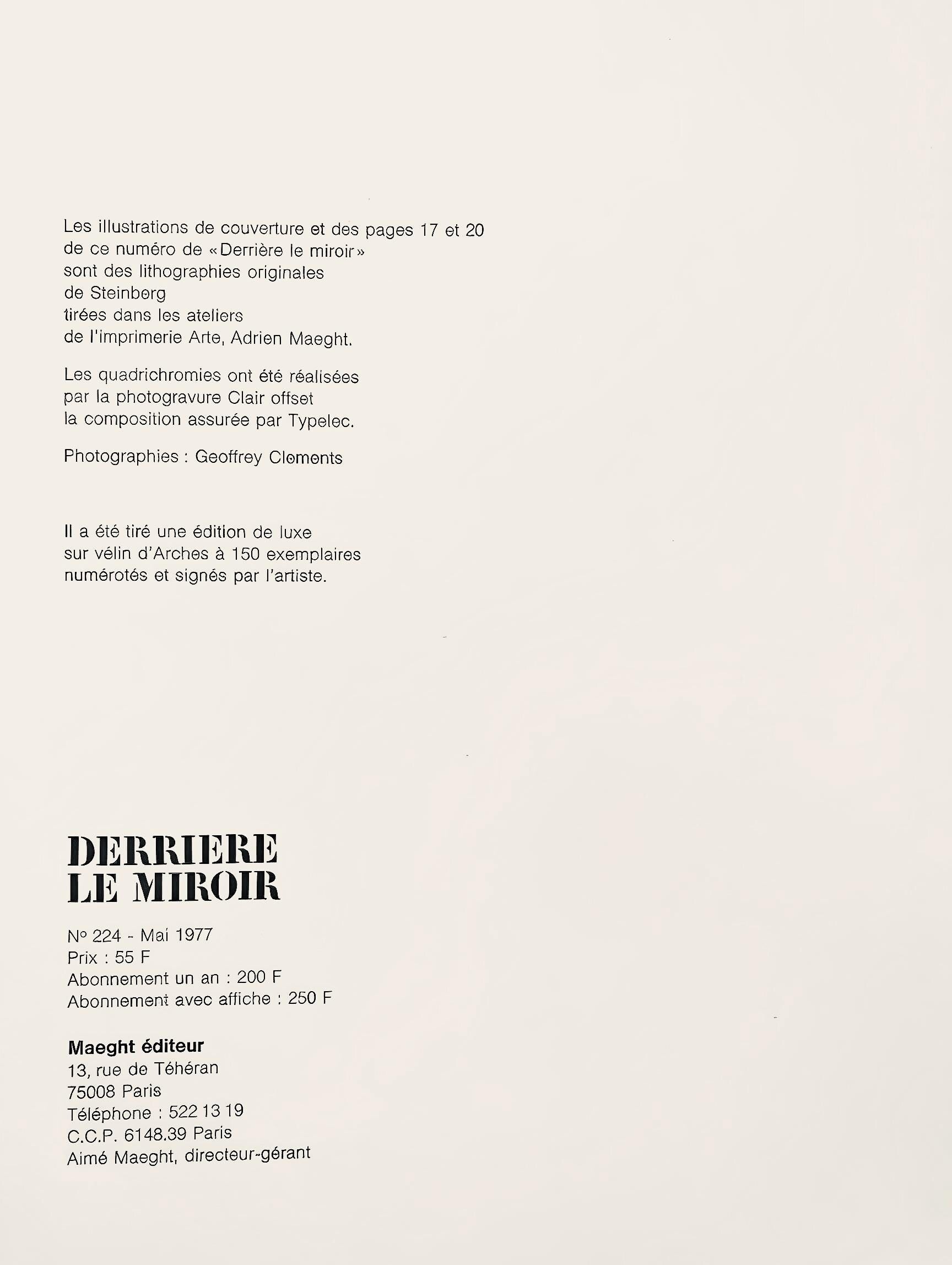 Excerpted from the volume (translated from French), The cover illustrations and pages 17 and 20 of this issue of "Behind the mirror" are original lithographs by Steinberg taken in the workshops of l'imprimerie Arte, Adrien Maeght.