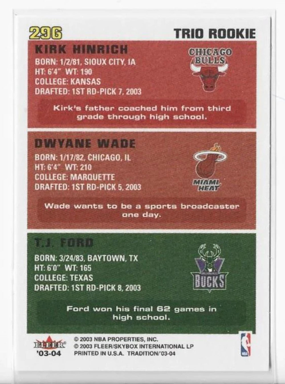 T.J. Ford / Dwyane Wade / Kirk Hinrich 2003-04 Fleer Trio Rookie #296 Card