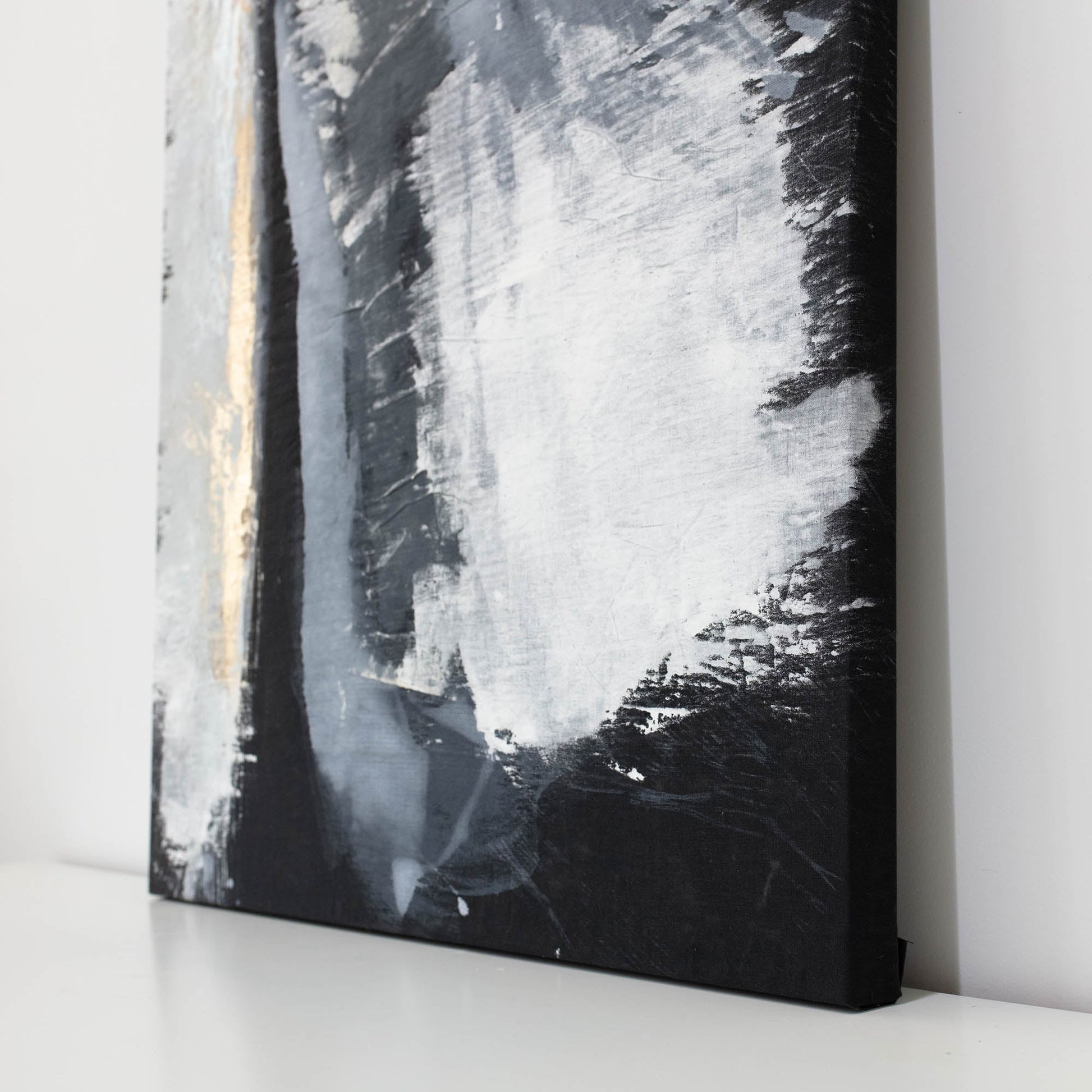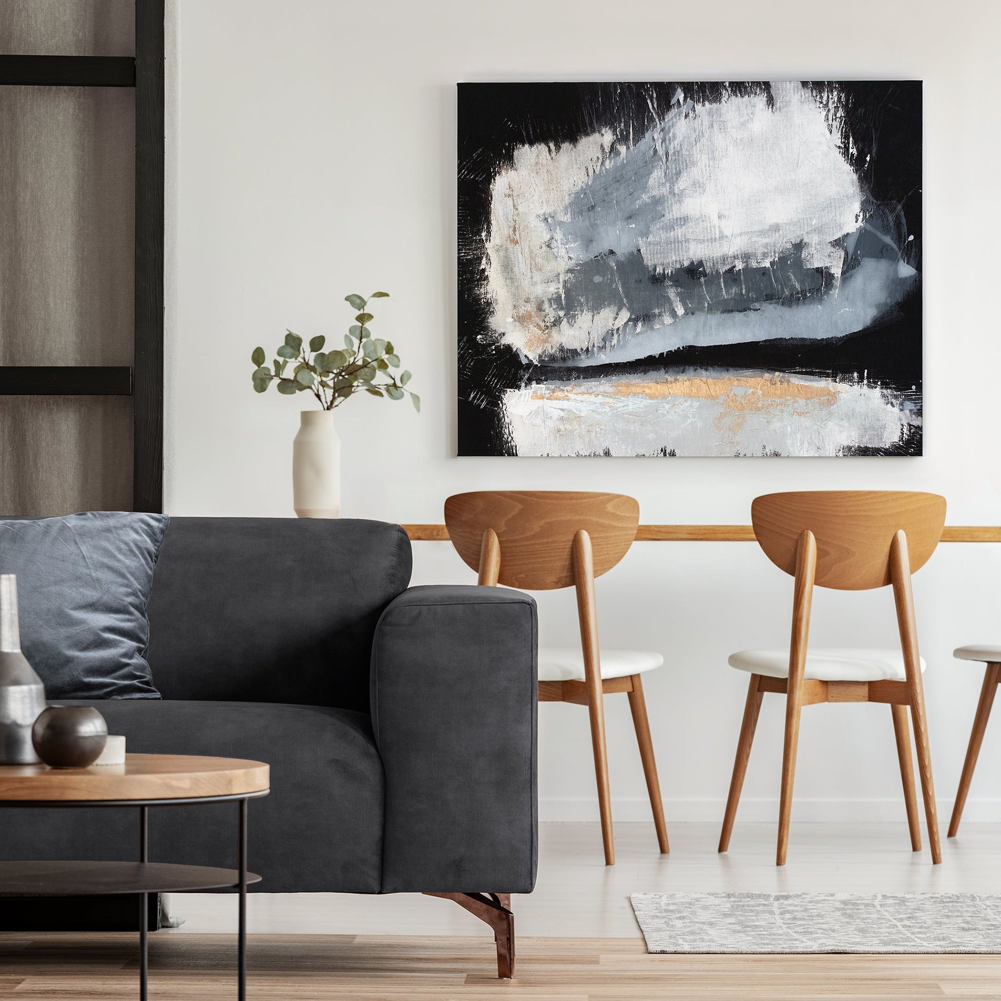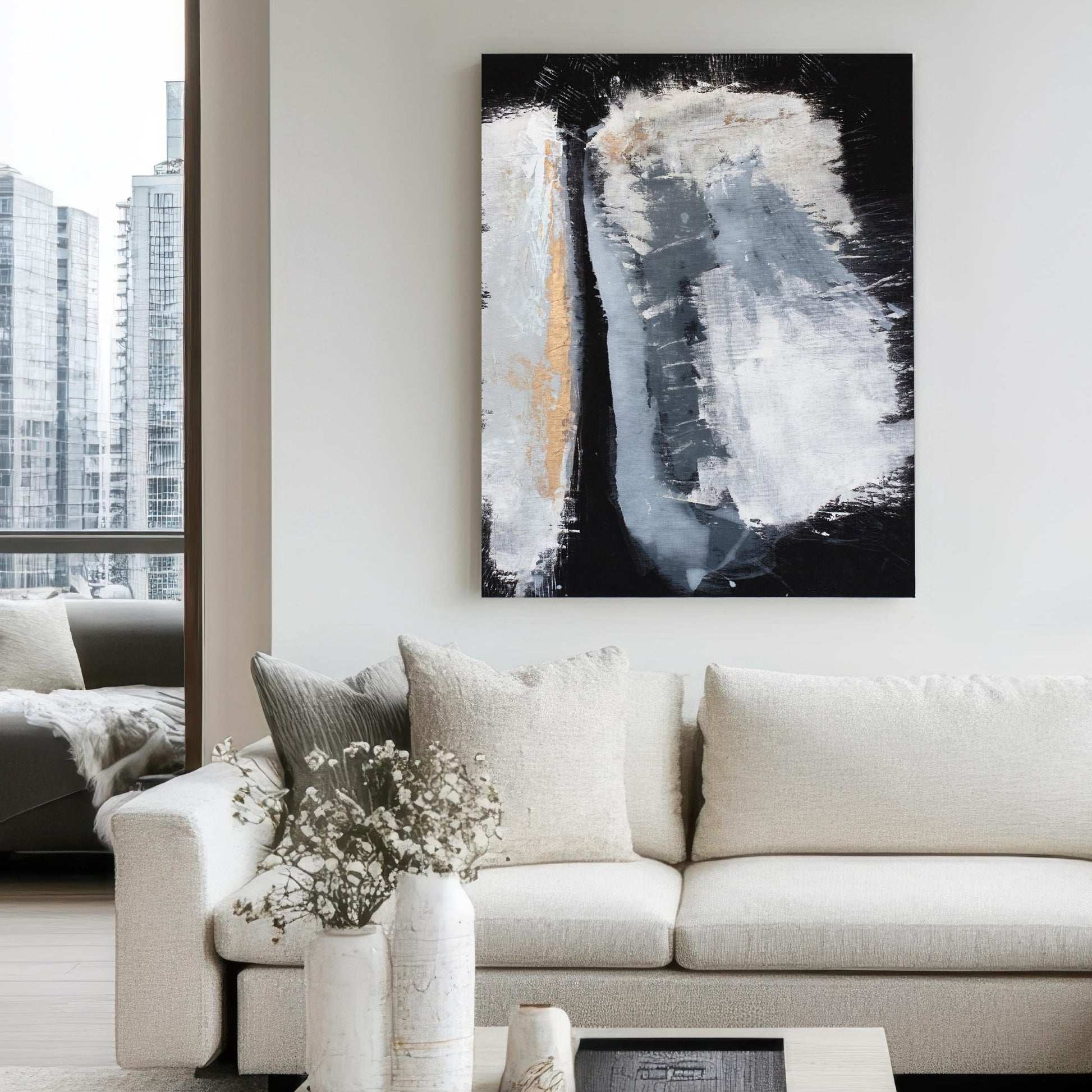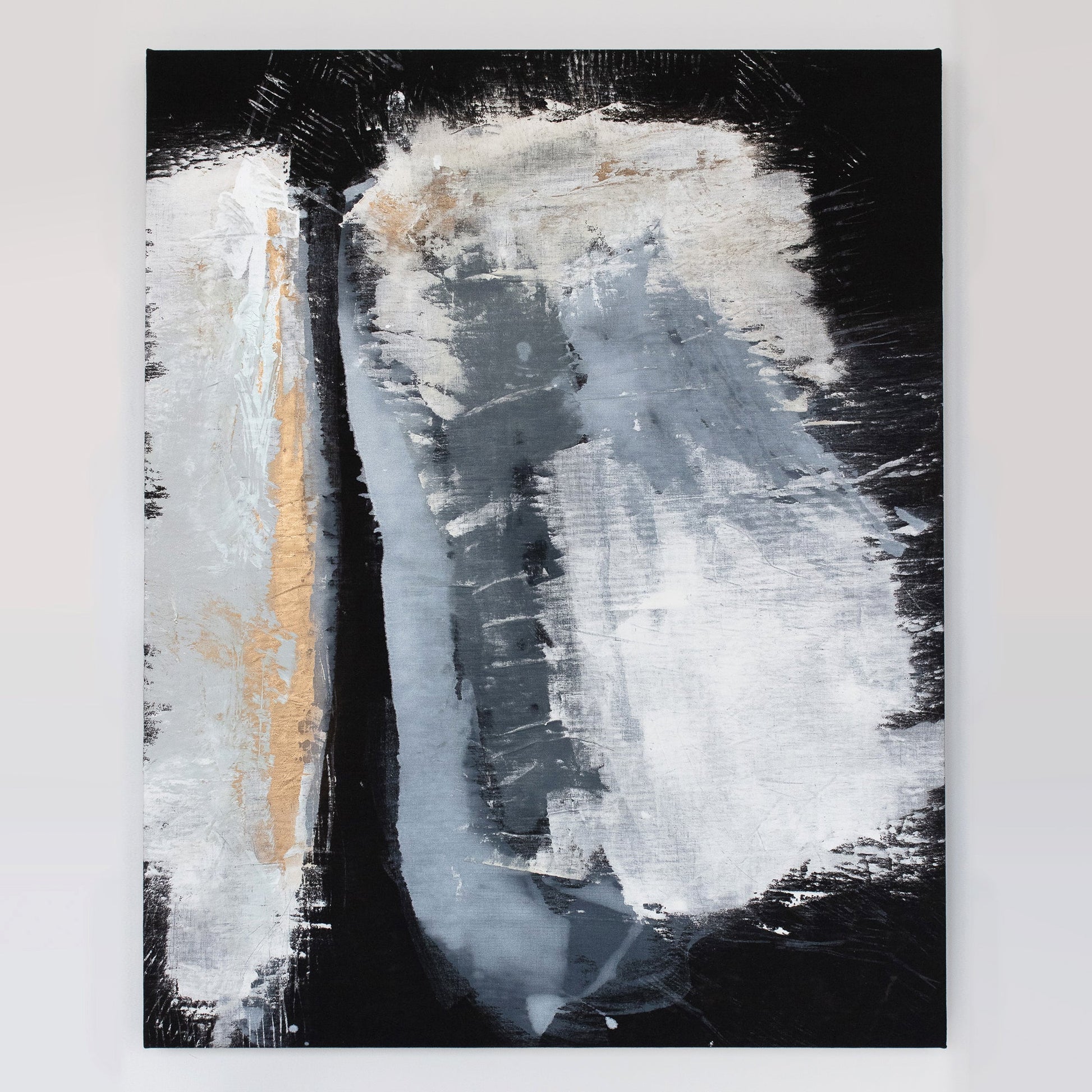 Washes of acrylic paint layer atop black linen to mark time and movement. This gallery wrapped canvashas paint marks that carry over to thesides. It comes wired and ready to hang. Signed on the back.