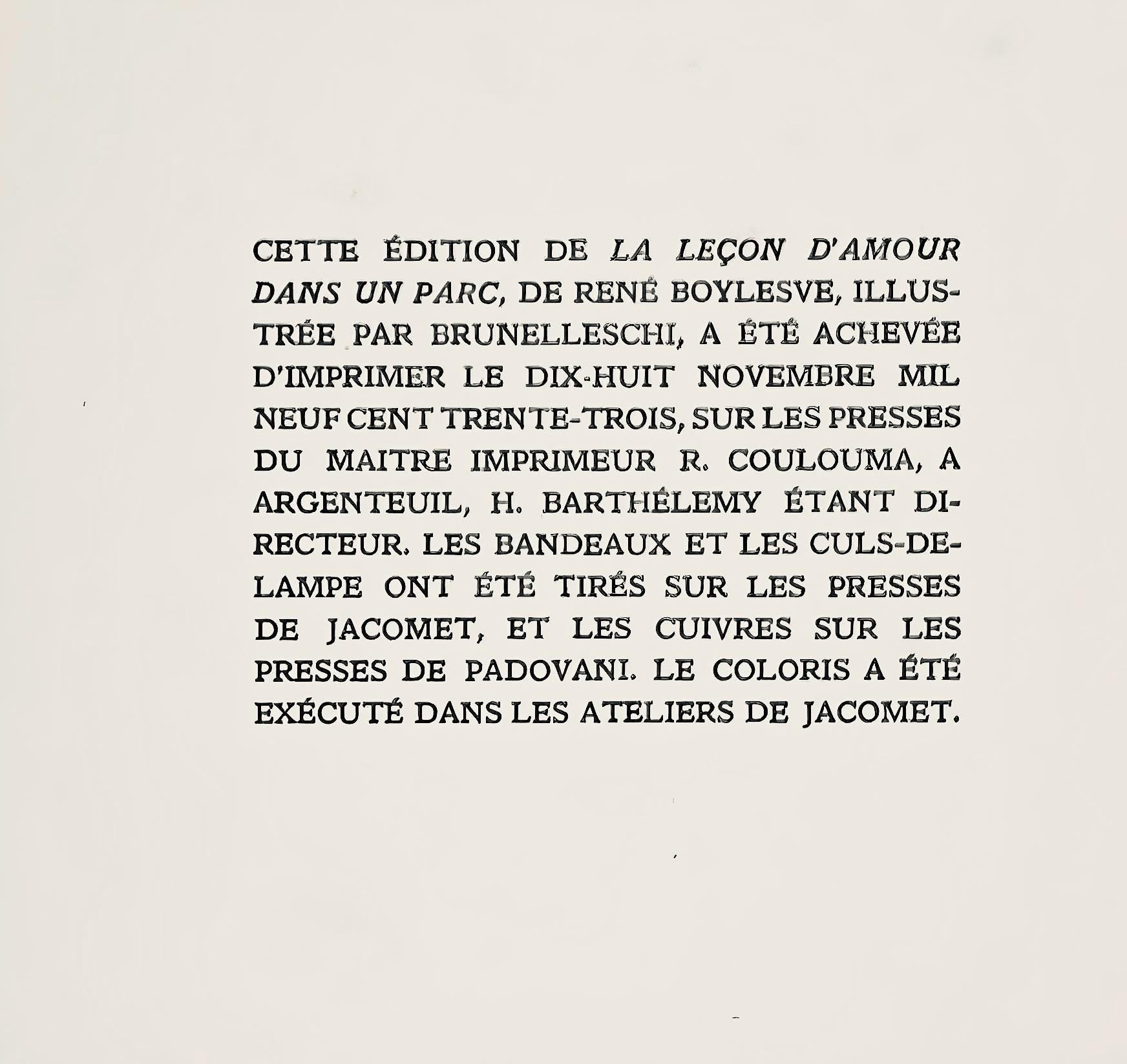 Lithograph and stencil on vlin dArches paper. Paper size: 13.11 x 10.039 inches. Excellent condition. Unsigned and unnumbered, as issued. Notes: From the volume, La Leon d'amour dans un parc, 1933. Published by ditions Albin Michel, Paris; printed by Ateliers de Jacomet, Paris, November 18, 1933. Excerpted from the volume (translated from French), This edition of La Leon d'amour dans un parc, by Ren Boylesve, illustrated by Brunelleschi, was completed to print on November 18, Nineteen, One Hundred and Thirty-Three, on the presses of the maitre imprimeur, R. Coulouma, A. Argenteuil, H. Barthlemy being director. The headbands and plates were shot on the Jacomet presses, and the coppers on the Padovani presses. The color plates were executed in the Ateliers de Jacomet. Justification of the draw, XX examples on Japon supernacr, containing a copper, an original watercolor of one of the hors texte and two sequels: one on Japon mince, one on Madagascar, numbered from I to XX. X examples on Japon supernacr, containing an original watercolor (bandeau) and two suites: one on Japon mince, one on Madagascar, numbered from XXI to XXX. X examples on Japon imprial, containing an original watercolor (band) and two sequels: one on Japon mince, one on Madagascar, numbered from XXXI to XL. XX examples on Hollande, containing an original watercolor (cul-de-lampe) and two sequels: one on Hollande mince, one on Annam, numbered from XLI to LX. XV examples on Arches, containing a suite on Annam, numbered from LXI to LXXV. CCCLXXV examples on Arches, numbered from LXXVI to CDL. It was also shot: XIV non-commercial examples, including VI nominative and VIII marked from A to H.