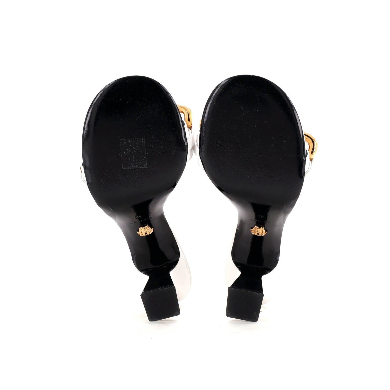 Condition: Very good. Minor scuffs throughout, minor color transfer on heels and straps, minor discoloration in interior, peeling, discoloration, scuffs, and indentations on outer soles, scratches on hardware.