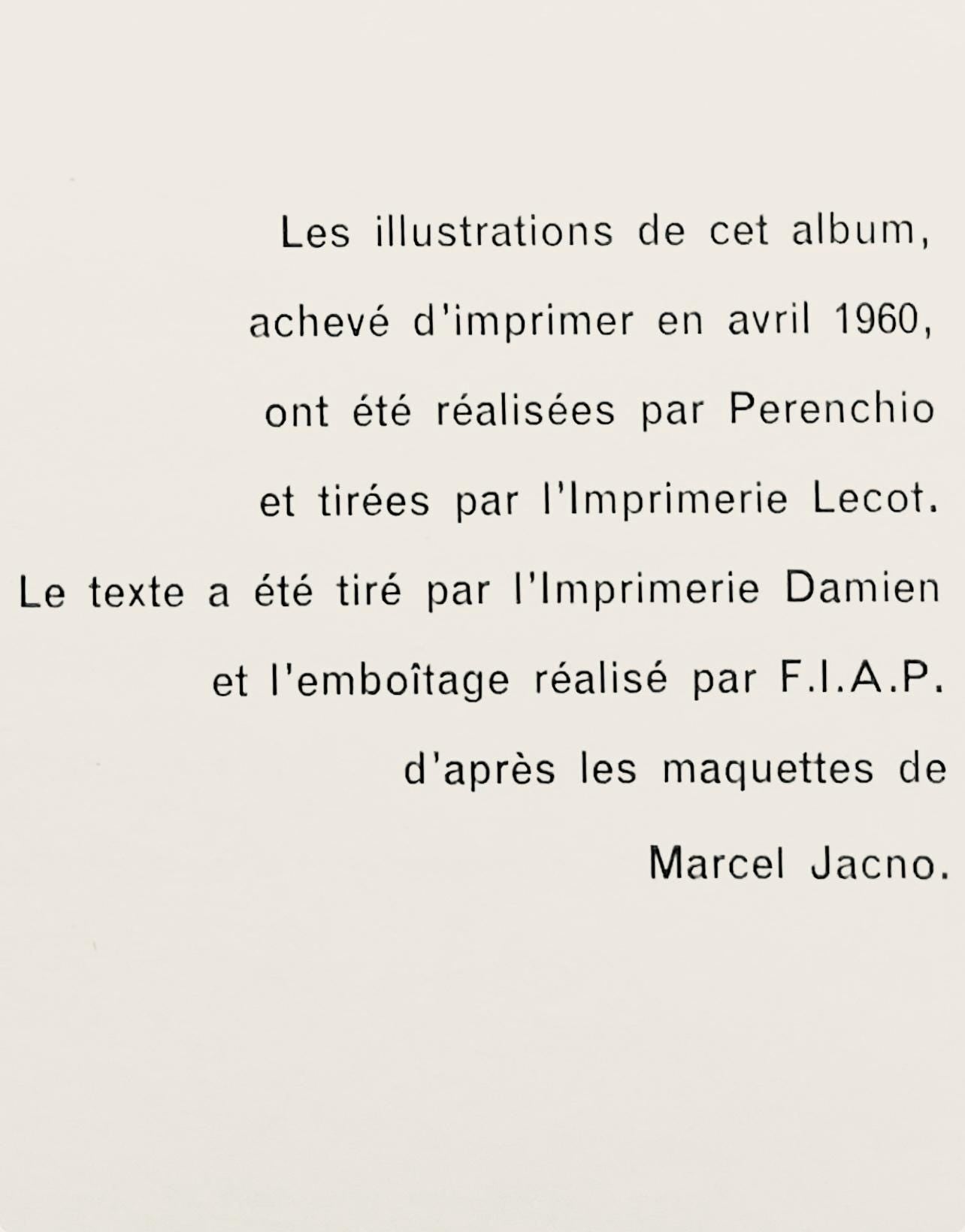 Excerpted from the folio (translated from French), The illustrations of this album, finished printing in April 1960, were produced by Perenchio and shot by l'Imprimerie Lecot.