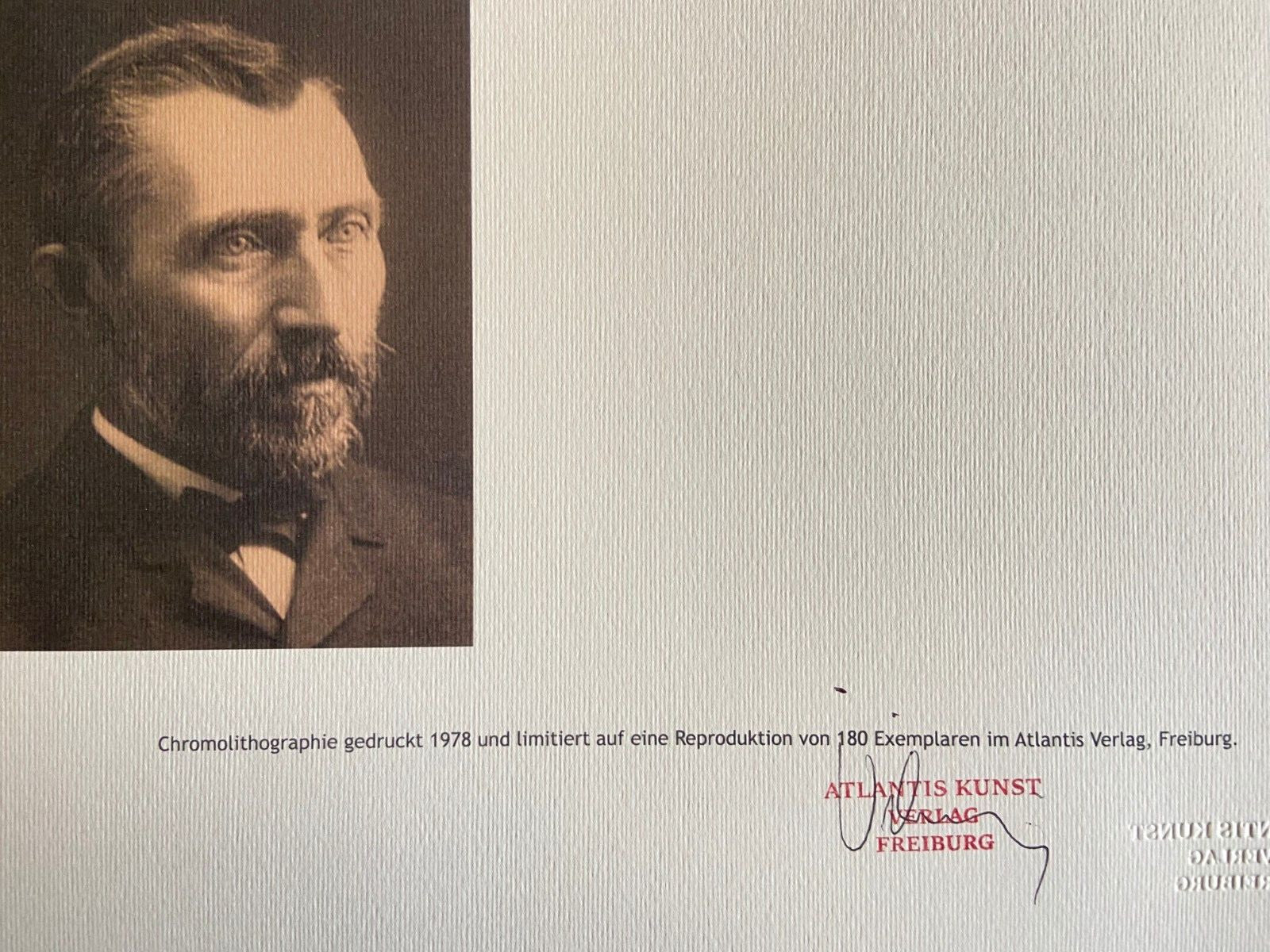 Vincent Van Gogh Lithograph Signed Numbered (Egon Schiele) Vincent Van Gogh " Self-portrait with hat " Chromolithograph printed in 1978 in 180 copies by Atlantis Verlag, Freiburg 32 x 40 cm Signature Vincent Van Gogh on the plate Dry stamp and authentication of the publishing house Atlantis Kunst Verlag Freiburg Vincent Van Gogh "Self-portrait with hat" Chromolithograph printed in 1978 in 180 copies by Atlantis Verlag, Freiburg 32 x 40 cm Signature Vincent Van Gogh on the plate Dry stamp and authentication of the publishing house Atlantis Kunst Verlag Freiburg