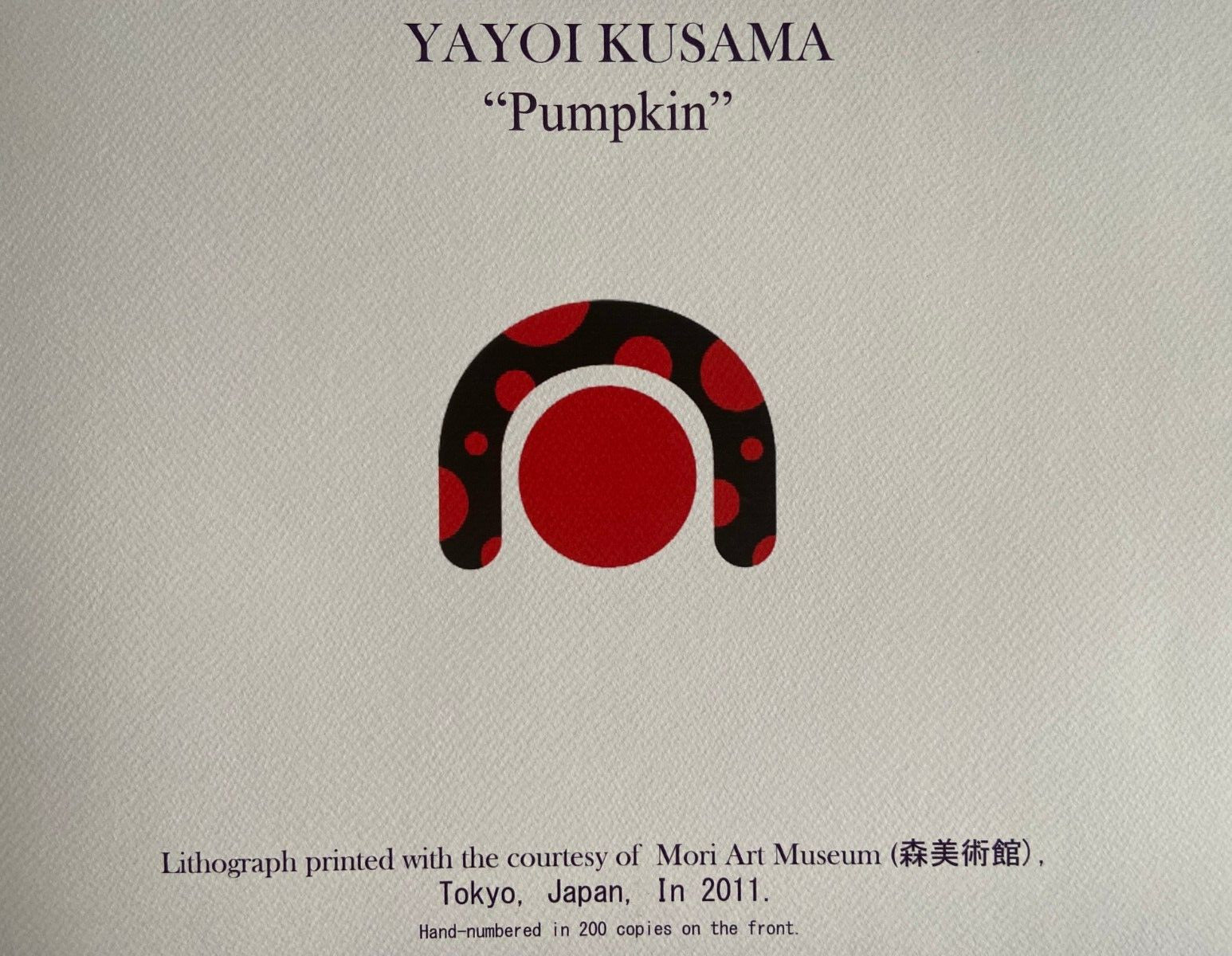 Yayoi Kusama "Pumpkin" The lithograph was printed in 2011 by the Mori Art Museum in 200 hand-numbered copies. The work measures 32 x 38 cm Mori Art Museum, Tokyo, Japan. Yayoi Kusama "Pumpkin" The lithograph was printed in 2011 by the Mori Art Museum in 200 hand-numbered copies. The work measures 32 x 38 cm © Mori Art Museum, Tokyo, Japan.